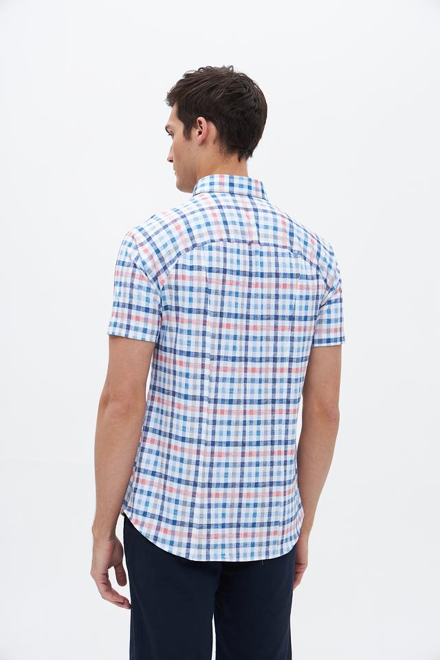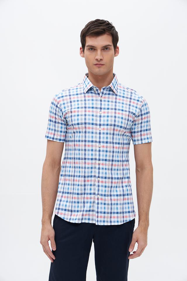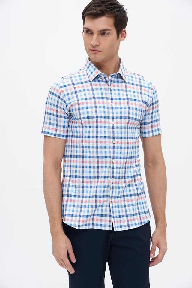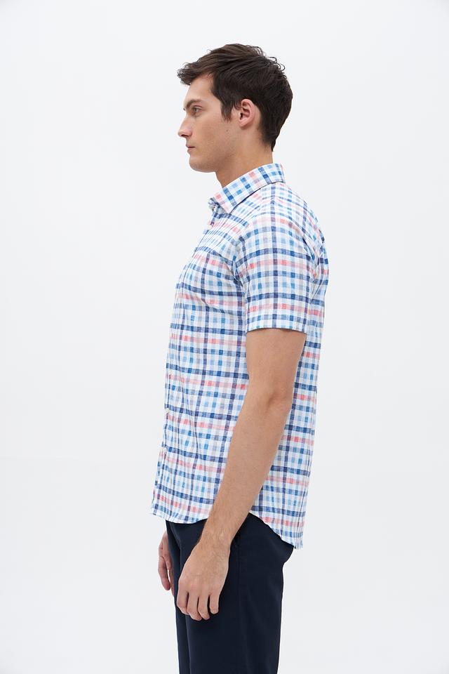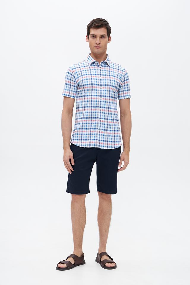 Особенностью данной модели является яркий клетчатый принт, сочетающий в себе оттенки синего, розового и белого. Такая расцветка добавит вашему образу свежести и индивидуальности. Рубашка идеально сочетается с шортами, брюками чинос или джинсами.