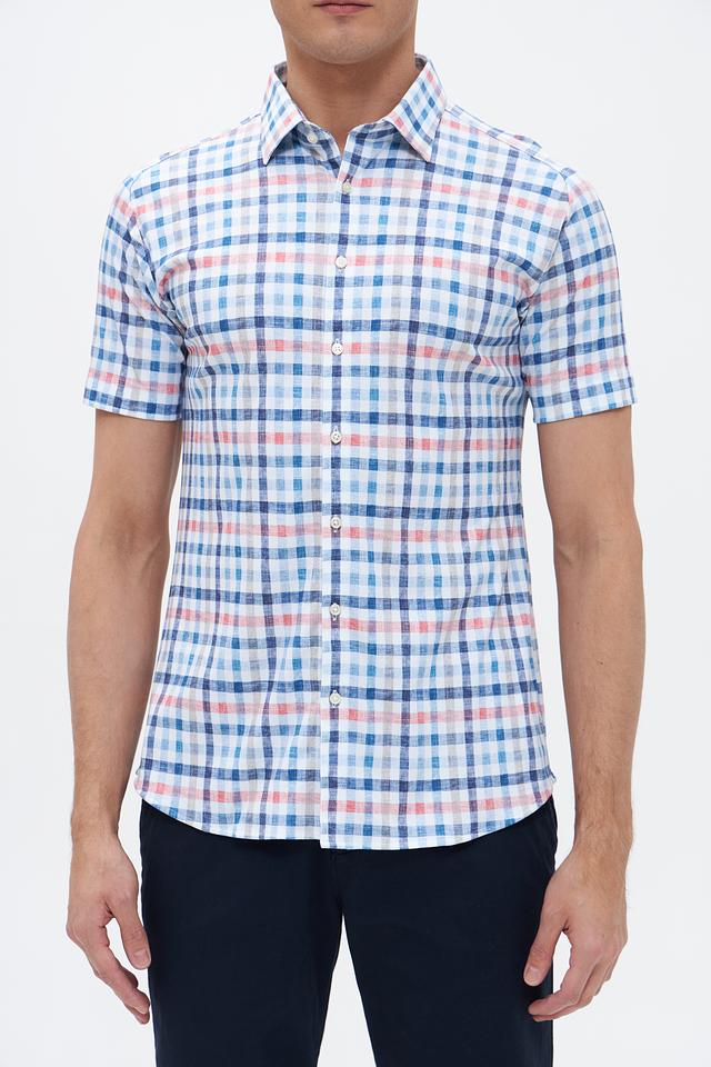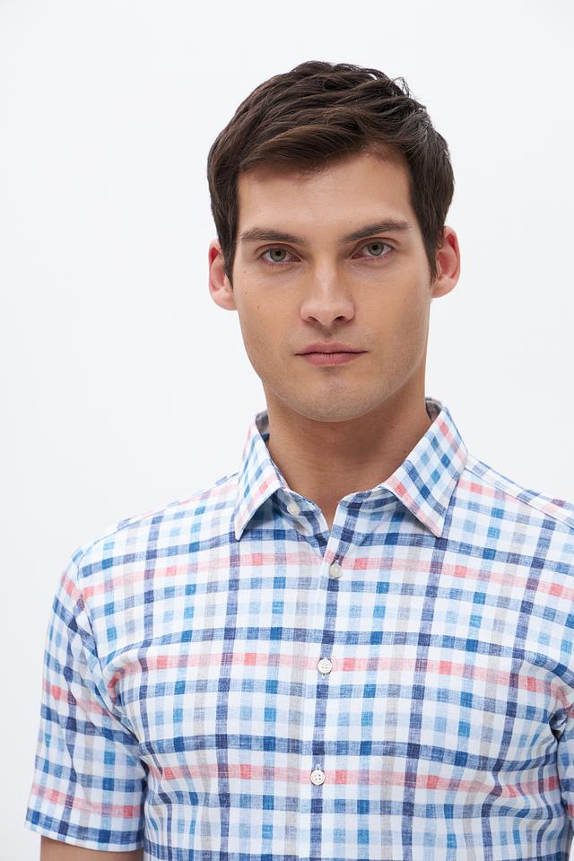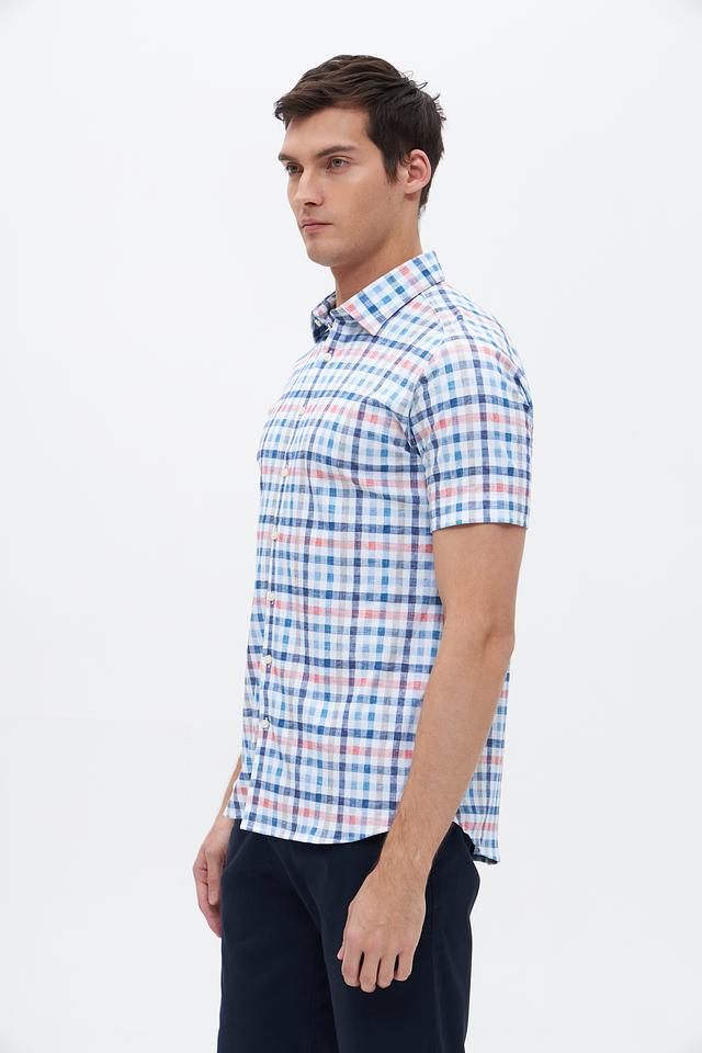Мужская рубашка Desoto с коротким рукавом выполнена в светлой клетке из сочетания синего, розового и белого цветов. Изготовлена из 100% хлопка, обеспечивающего комфорт и воздухопроницаемость. Состав: хлопок 100%