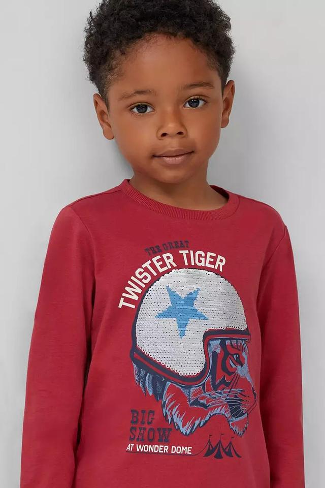Эта яркая и стильная футболка от s.Oliver станет любимой вещью в гардеробе вашего сына. Футболка выполнена в насыщенном красном цвете и украшена эффектным принтом с изображением тигра в шлеме.