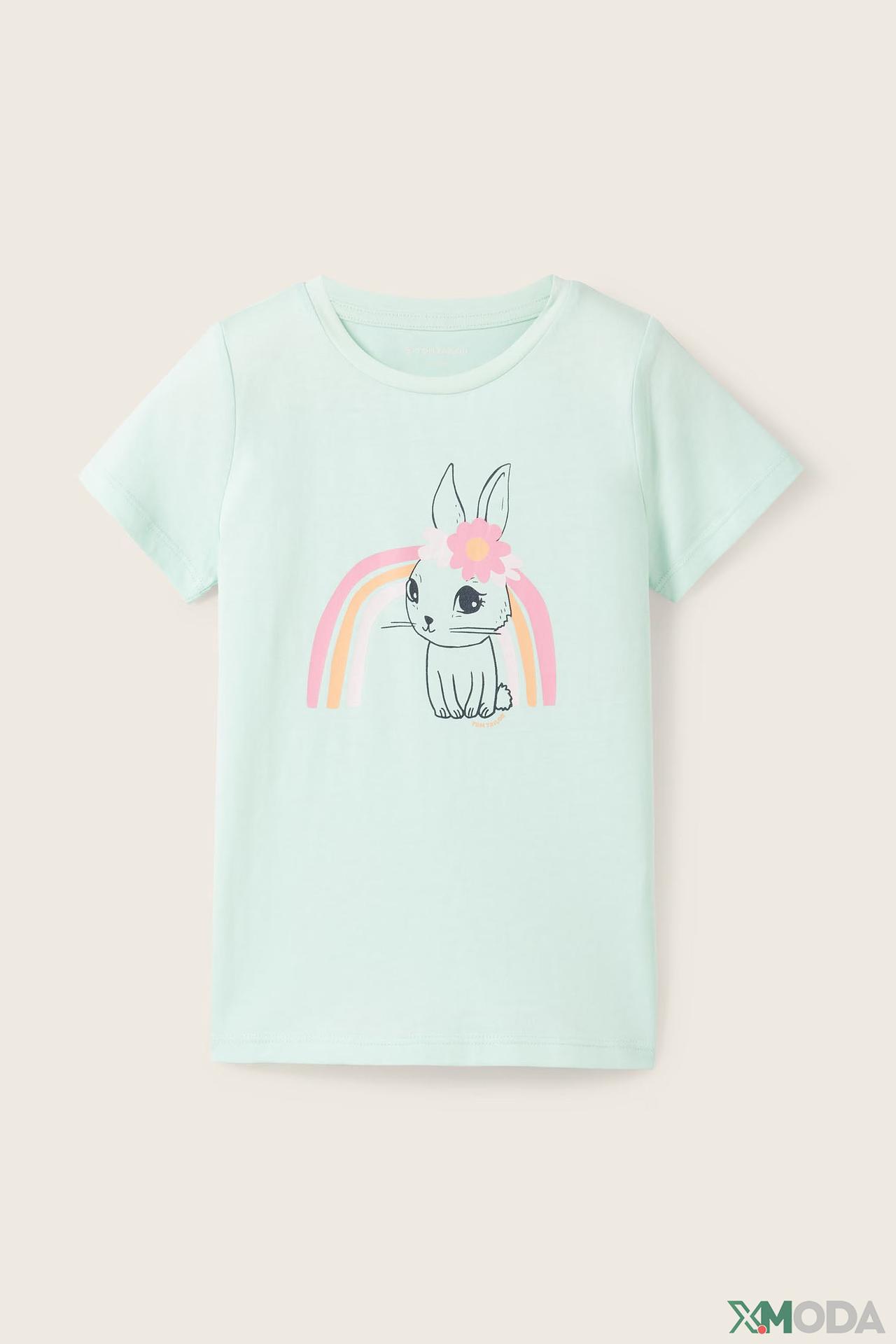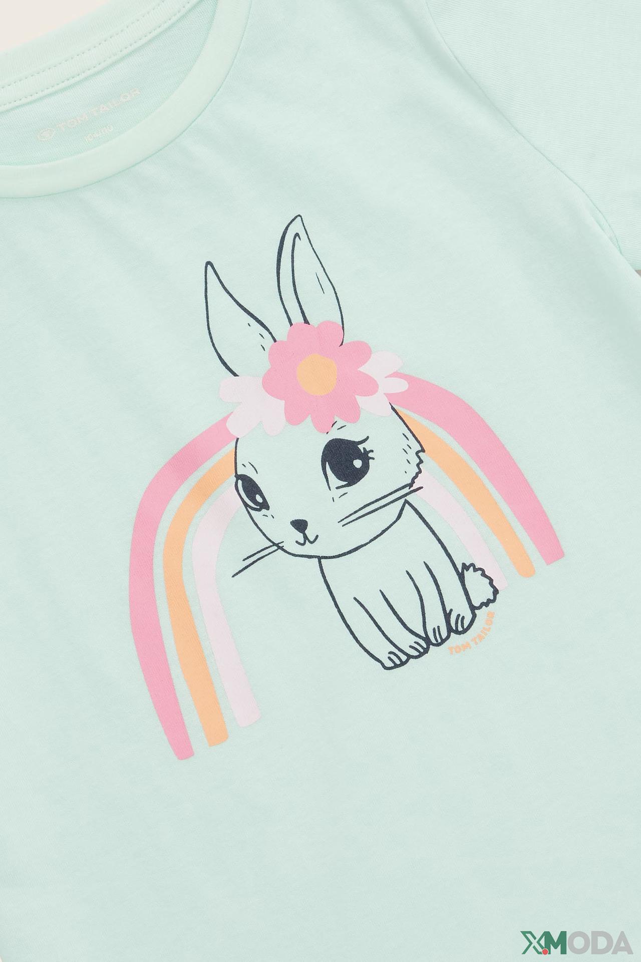 Стильная детская футболка от Tom Tailor – идеальный выбор для вашего маленького непоседы! Изготовлена из 100% мягкого хлопка, она подарит комфорт и свободу движений на весь день. Яркий принт с милым зайчиком и радугой обязательно понравится вашему ребенку и поднимет настроение.