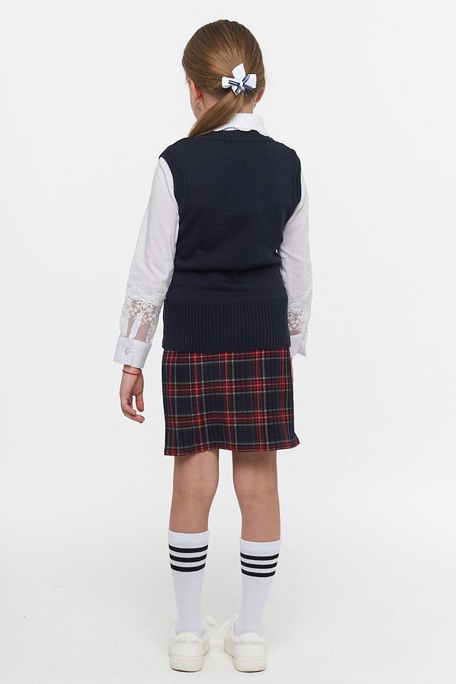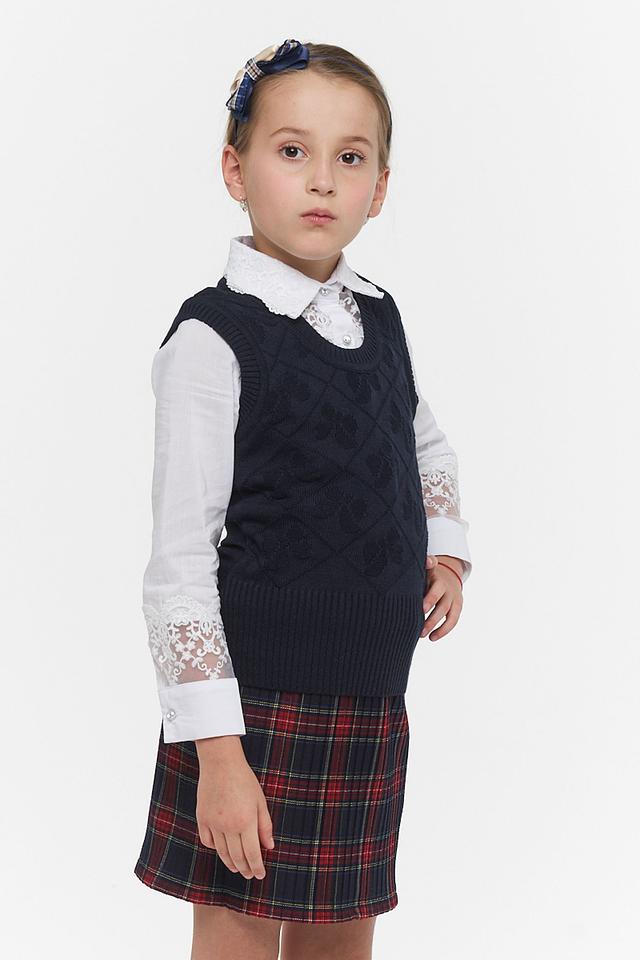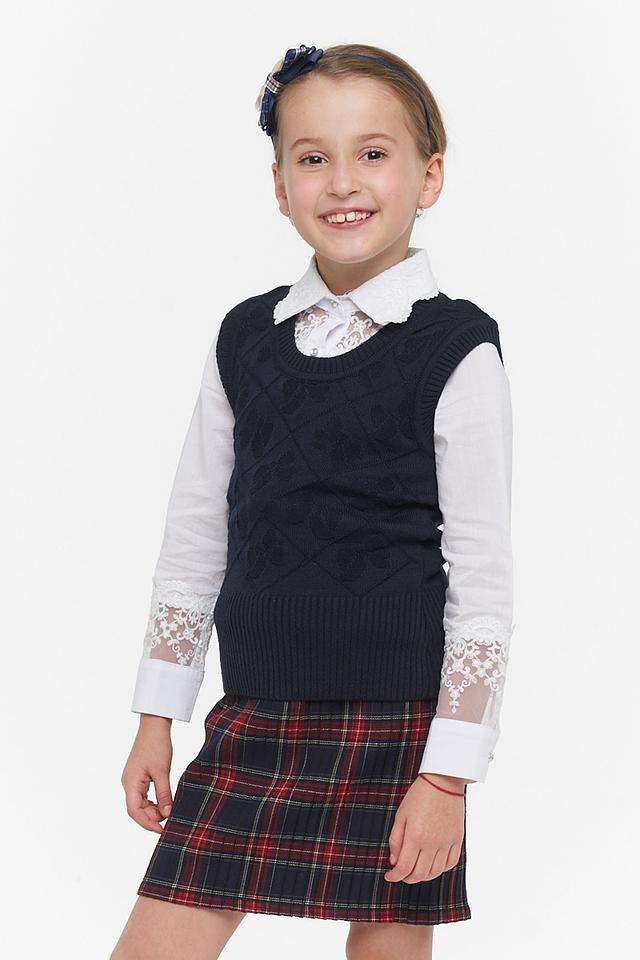 Синий жилет от VAY для девочки, выполнен из мягкого трикотажа с классическим ромбовидным узором. Идеально дополнит школьный гардероб или повседневный образ, обеспечивая комфорт и тепло. Состав: хлопок 50%, акрил 50%