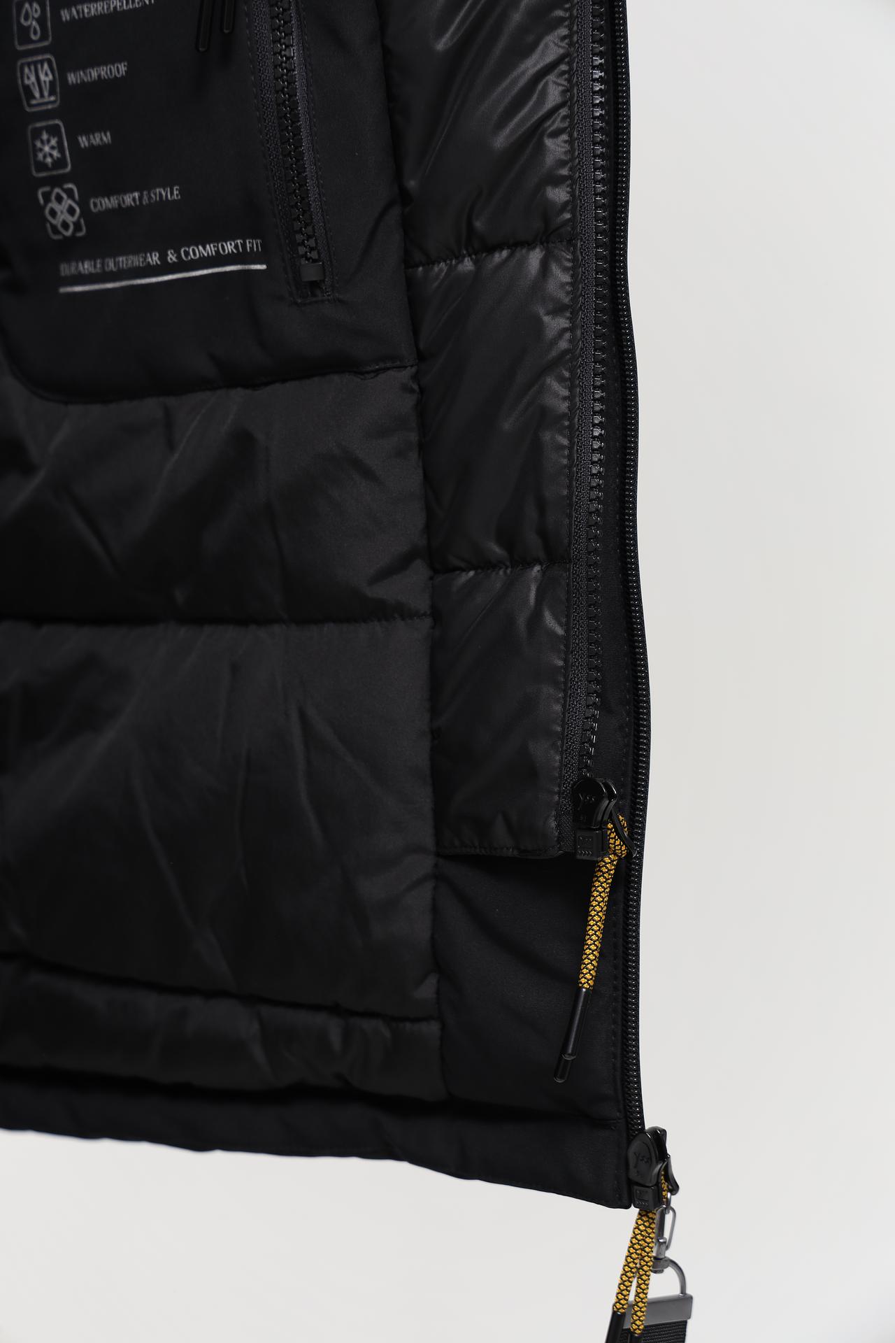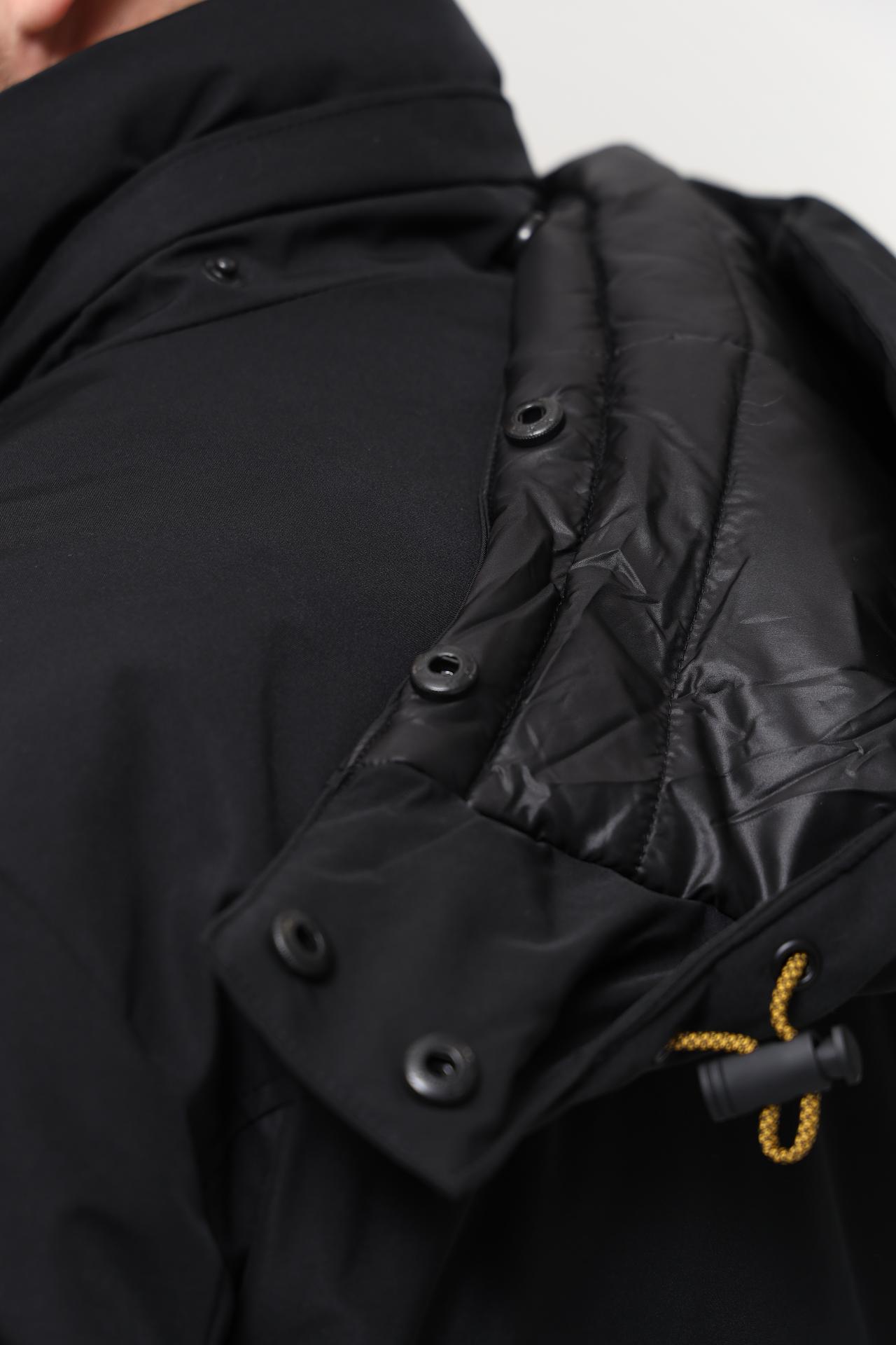 - Дизайн: Стильная черная куртка с капюшоном и продуманными деталями. Модель дополнена контрастной желтой фурнитурой и фирменным принтом, что придает ей уникальный вид.
