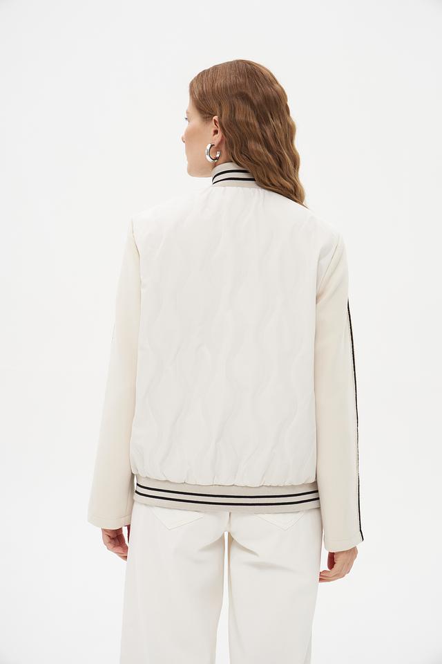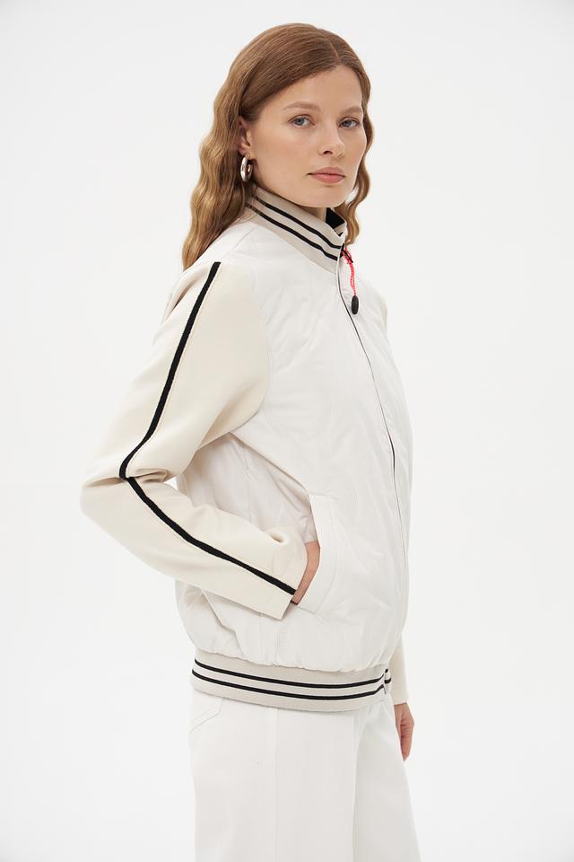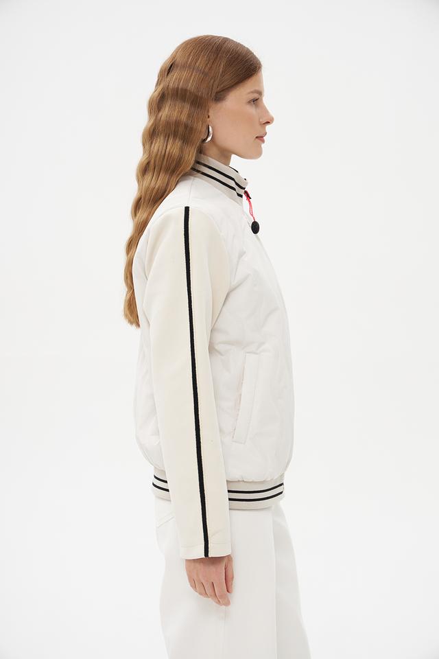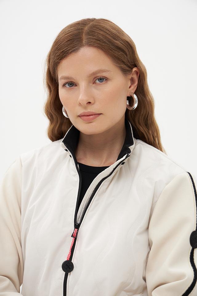 Белая куртка District с чёрными полосками – стильная и удобная модель для повседневной носки. Куртка выполнена из полиэстера, имеет застёжку-молнию и воротник-стойку. Состав: полиэстер 100%