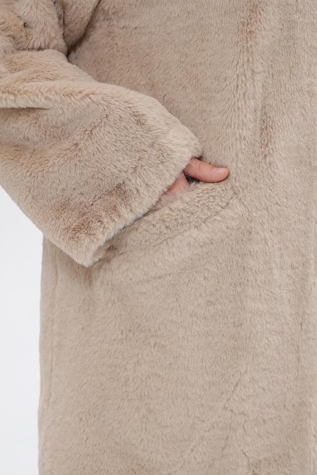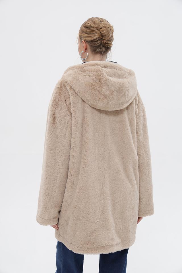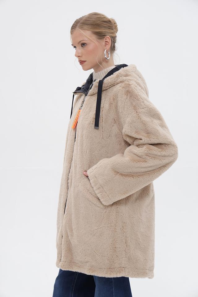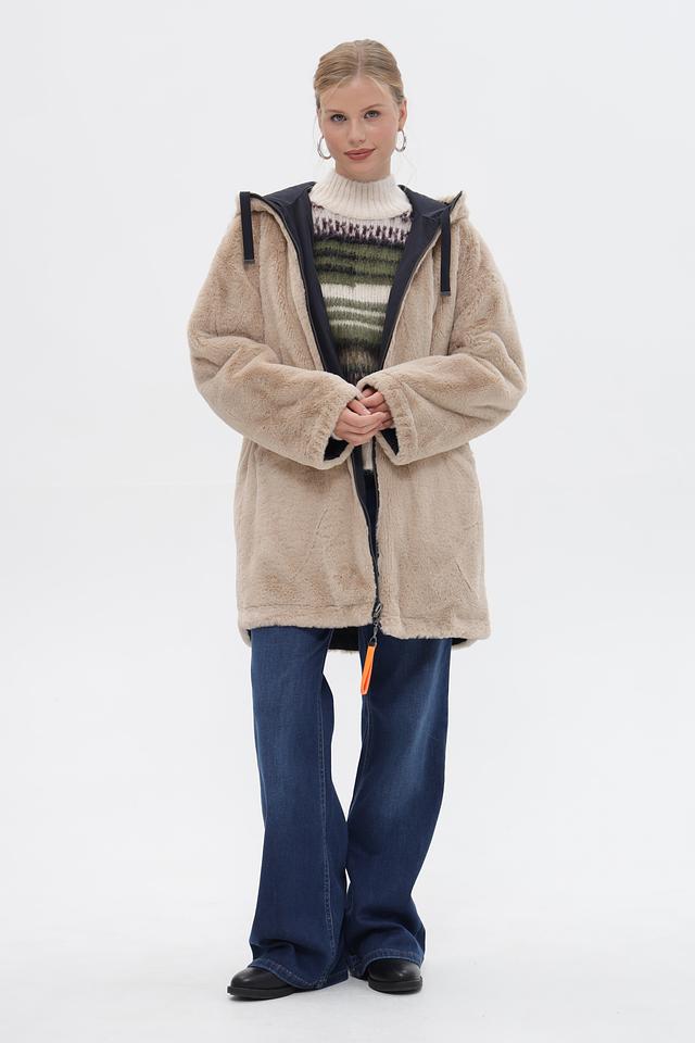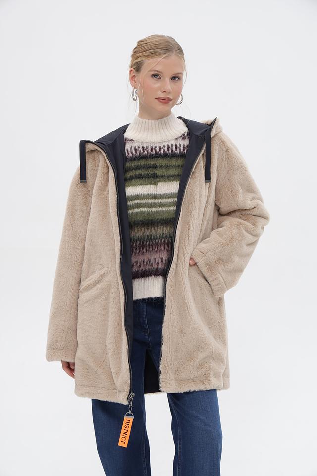 Бежевое пальто District из 100% полиэстера с капюшоном и застежкой на молнию. Мягкая текстура и удобный крой для комфорта в холодную погоду. Состав: полиэстер 100%