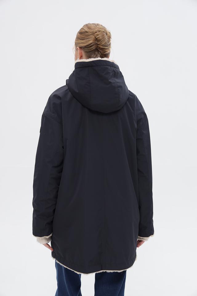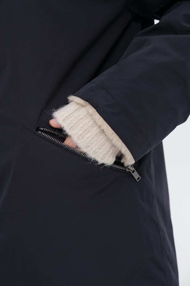 Пальто имеет прямой крой и длину до середины бедра. Наличие накладных карманов добавляет функциональности. Подкладка обеспечивает дополнительный комфорт при носке.