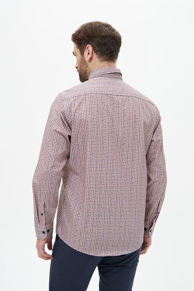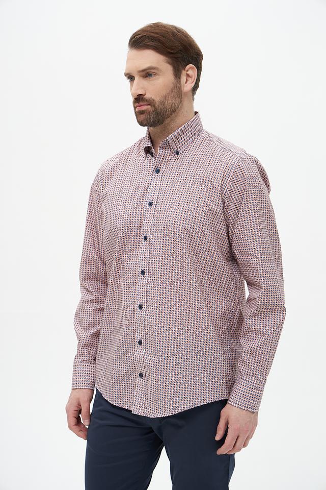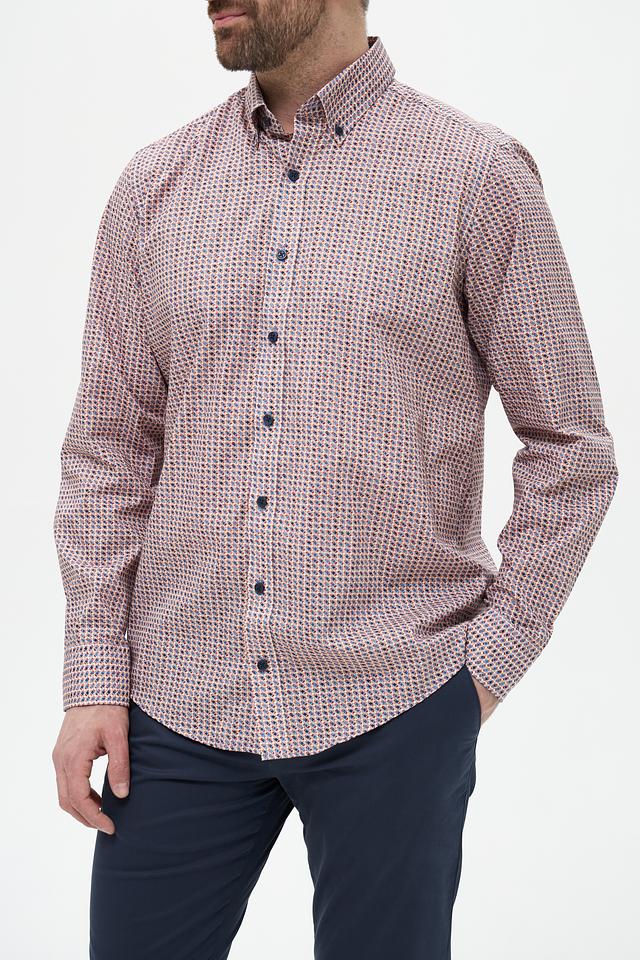 Особенности: Приталенный крой, геометрический принт, воротник button-down, длинные рукава с манжетами, 100% хлопок.