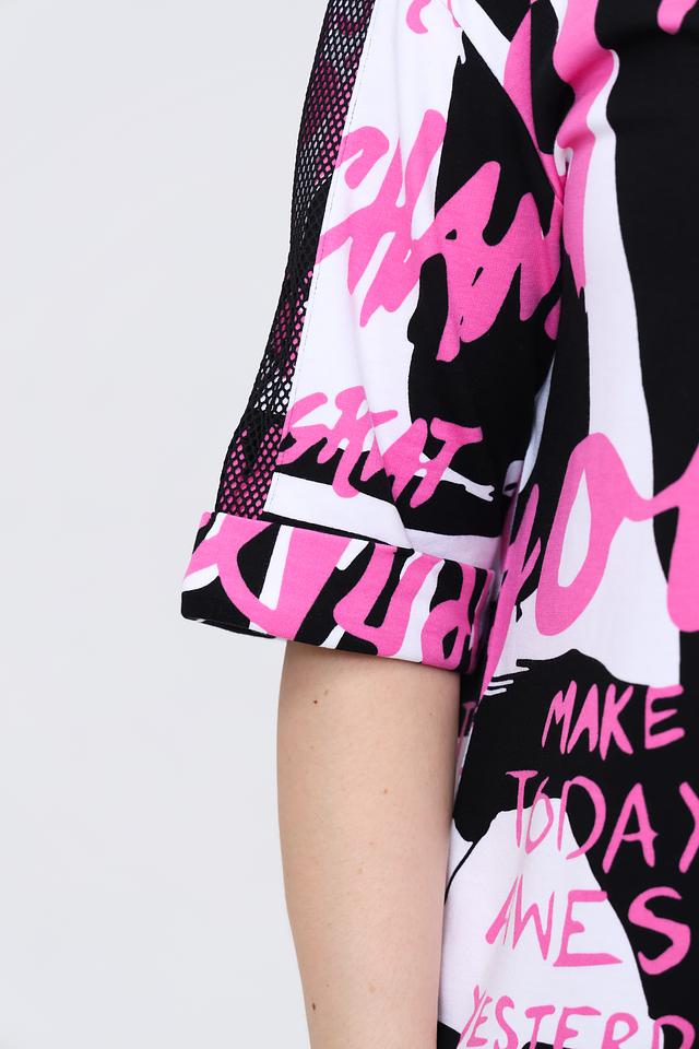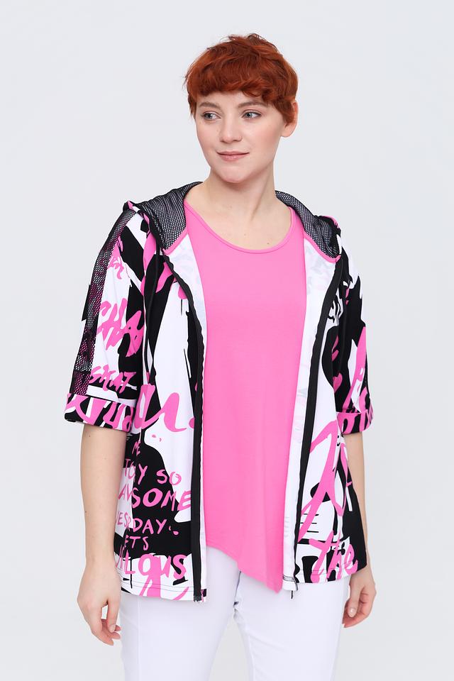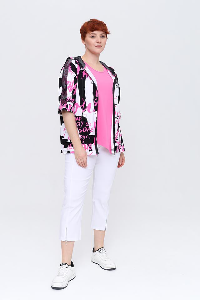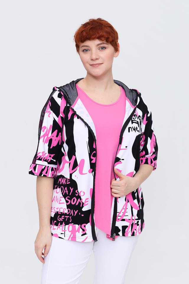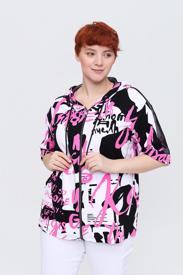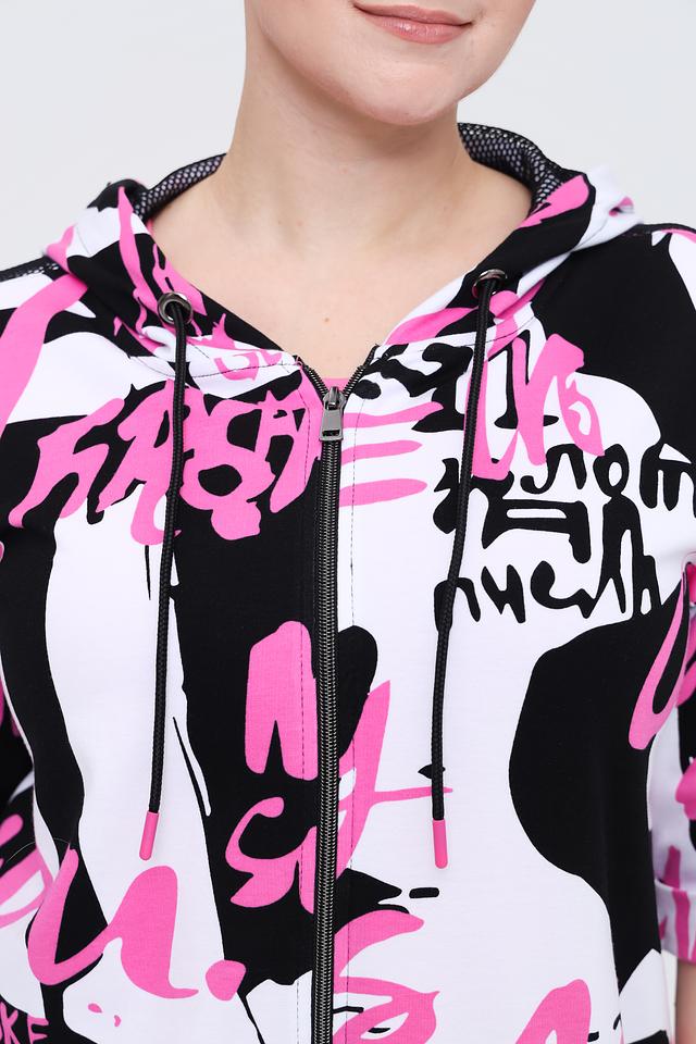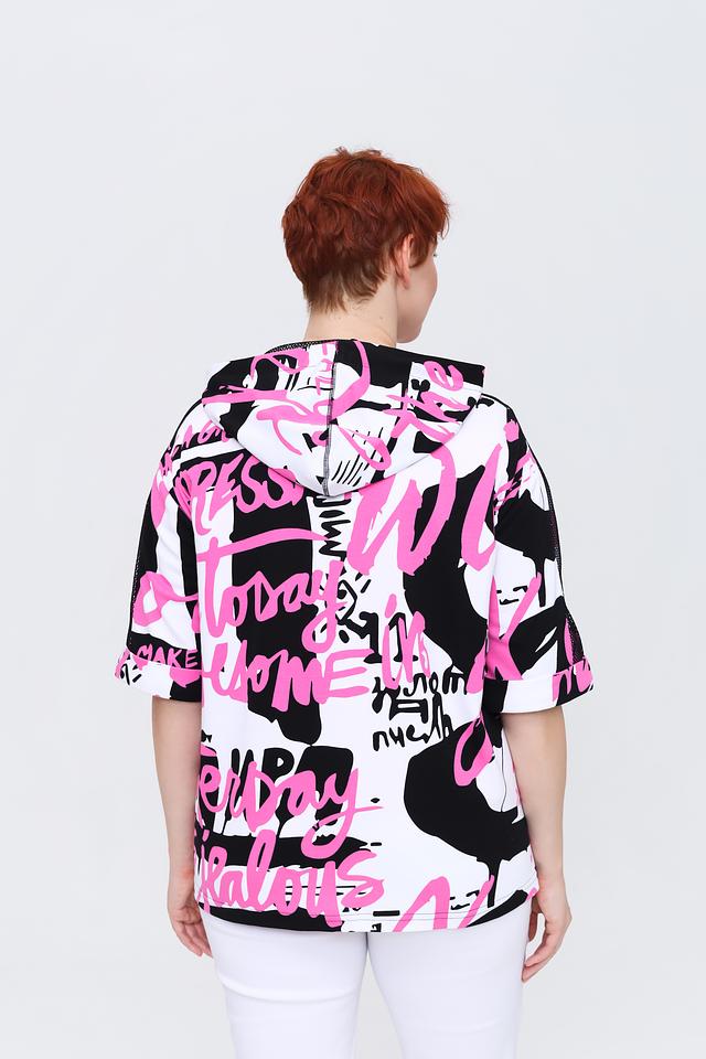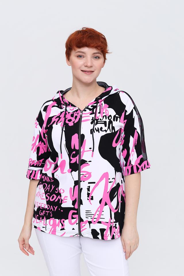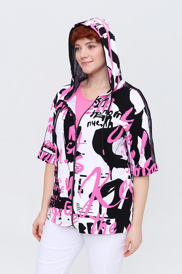 Жакет имеет короткие рукава и капюшон с молнией, что добавляет функциональности и стиля. Основной цвет жакета – белый, но он украшен эффектным принтом в чёрно-розовой гамме.