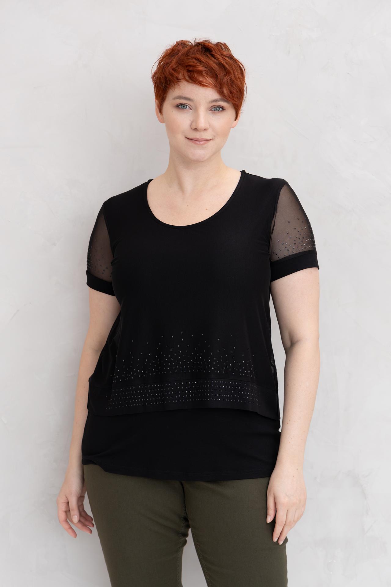 - Дизайн: Сочетание основной ткани с элегантными сетчатыми вставками на рукавах и декоративными стразами создает утонченный и современный вид.