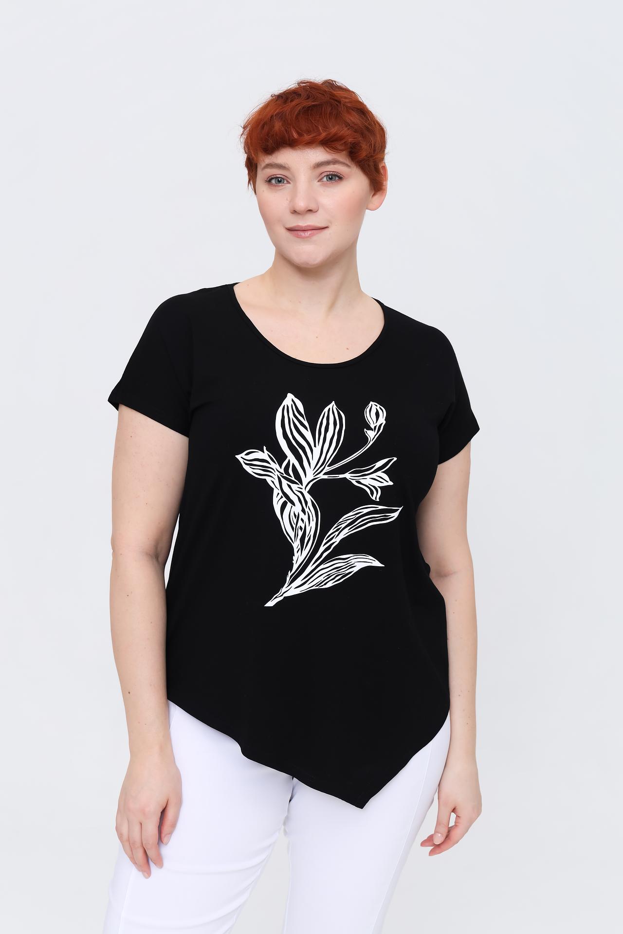 Базовая черная футболка от Doris Streich – идеальное дополнение к вашему гардеробу. Модель украшена стильным белым цветочным принтом, который придает изделию особую изюминку. Асимметричный подол добавляет образу оригинальности и динамики. Благодаря универсальному дизайну, футболка легко сочетается как с повседневными, так и с более элегантными нарядами.