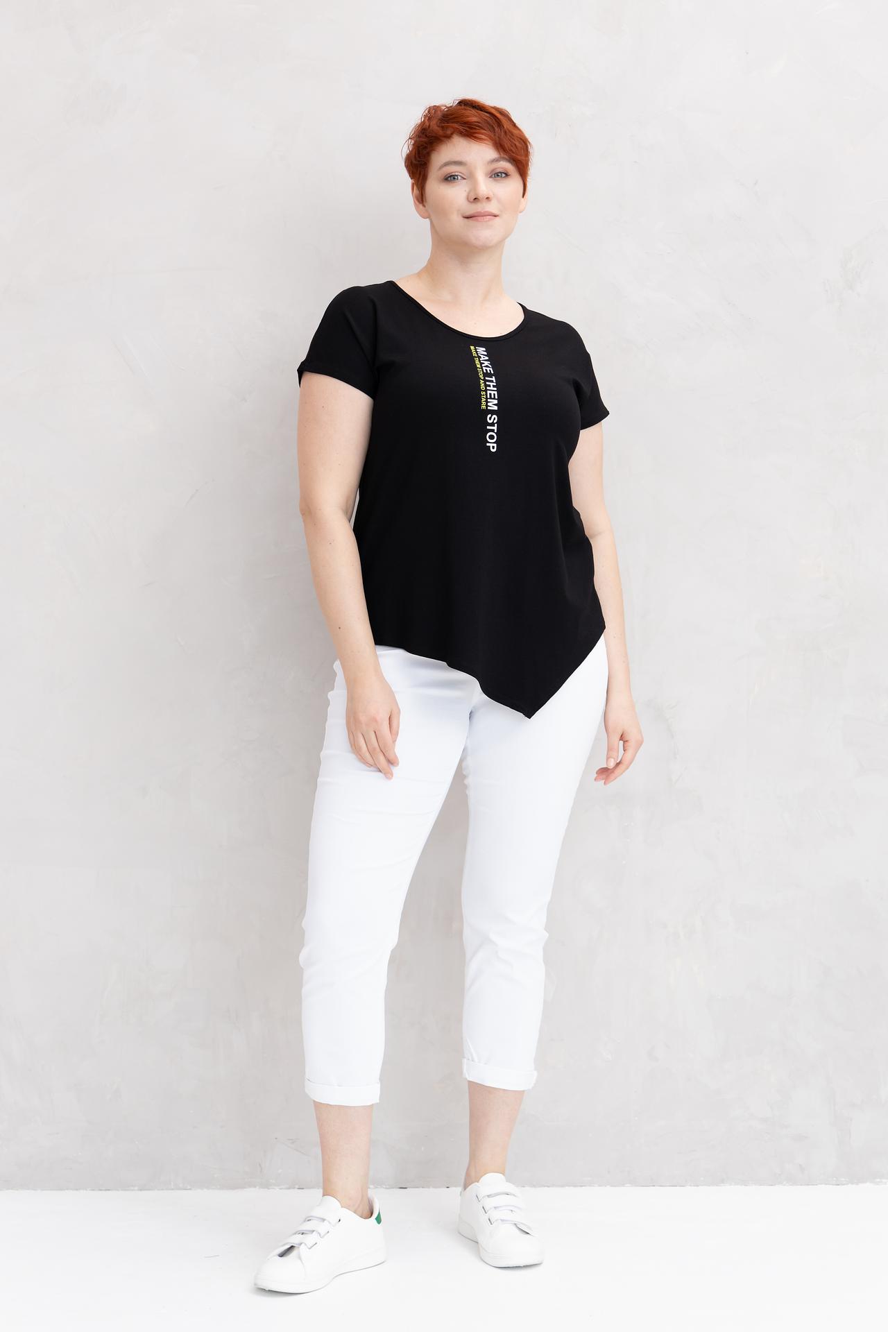 Эта черная футболка от Doris Streich – идеальный выбор для создания стильных и современных образов. Изготовленная из высококачественной вискозы с добавлением эластана, она обеспечивает непревзойденный комфорт и идеальную посадку по фигуре. Асимметричный крой и оригинальный принт с мотивирующей надписью 'MAKE THEM STOP AND STARE' придают модели особую изюминку и делают ее центром внимания.