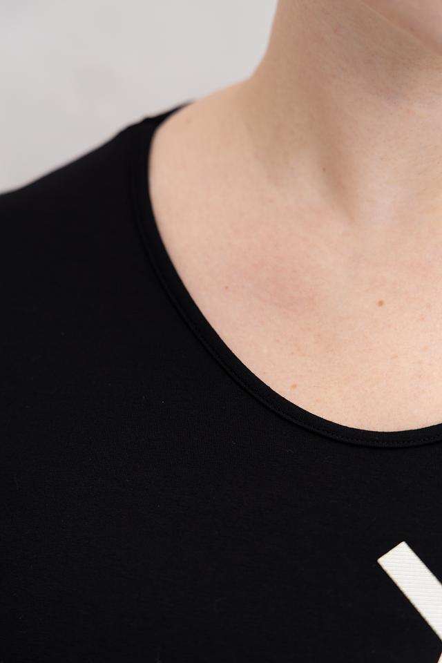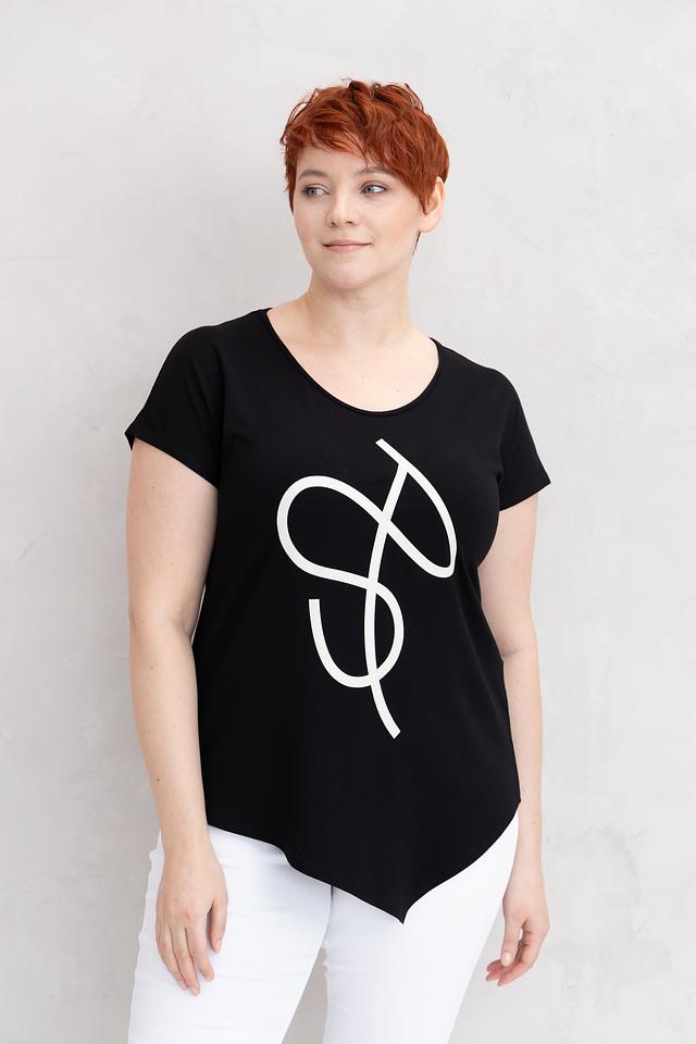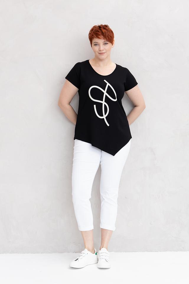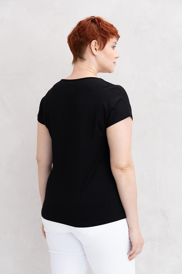 Чёрная футболка от Doris Streich с оригинальным белым принтом – стильная и комфортная базовая вещь. Изготовлена из мягкой вискозы с добавлением эластана, обеспечивающего удобную посадку по фигуре. Состав: вискоза 96%, эластан 4%