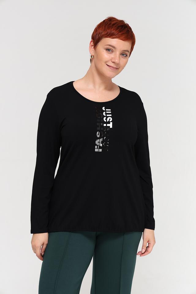 Черная блуза от Doris Streich с оригинальным принтом "JUST RIGHT". Изготовлена из мягкой вискозы с добавлением эластана для комфорта и лучшей посадки. Состав: вискоза 96%, эластан 4%
