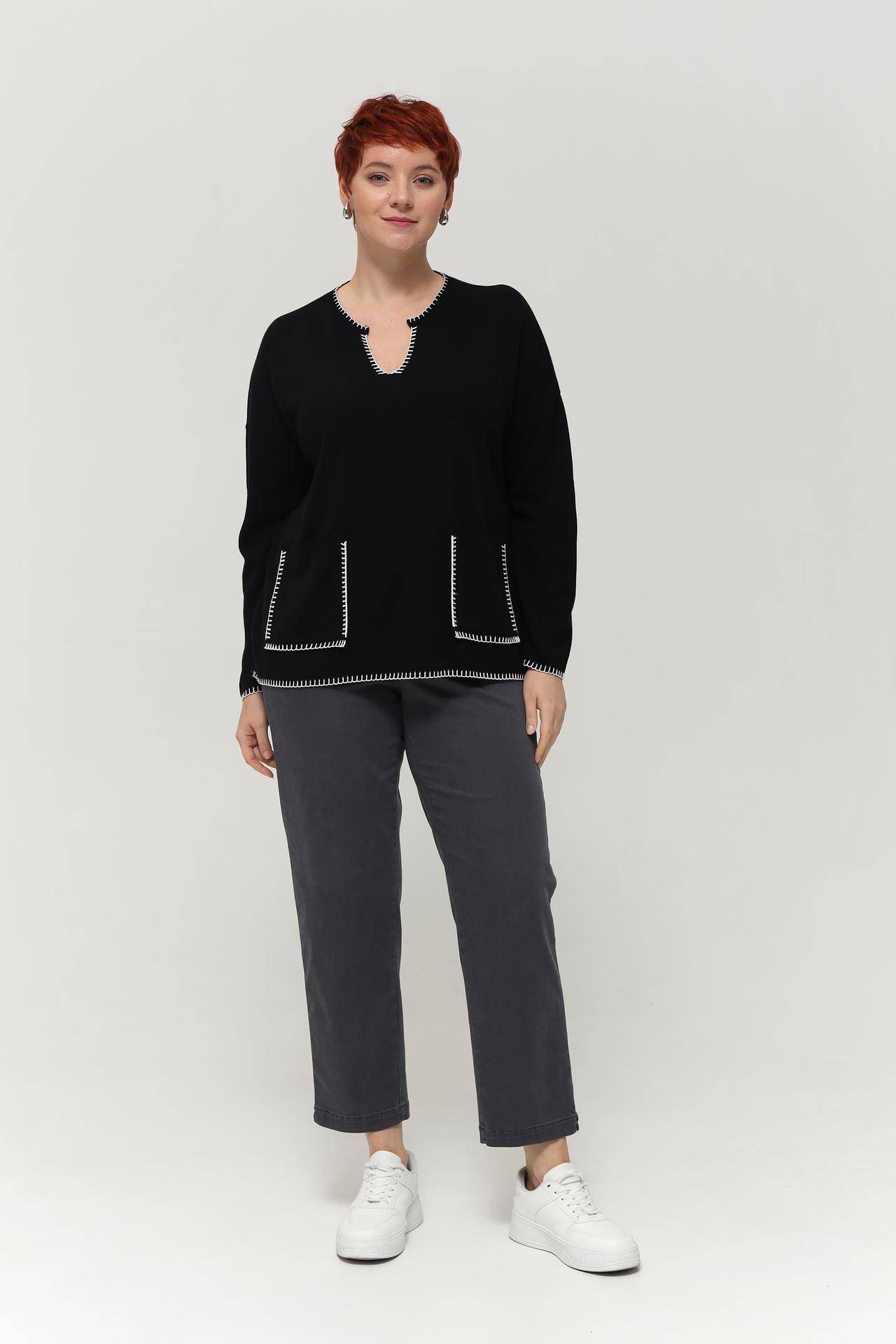 - Дизайн: Классический крой с V-образным вырезом и декоративной контрастной отстрочкой по горловине, краям накладных карманов и по низу изделия. Такая отделка добавляет изюминку и делает пуловер более выразительным.