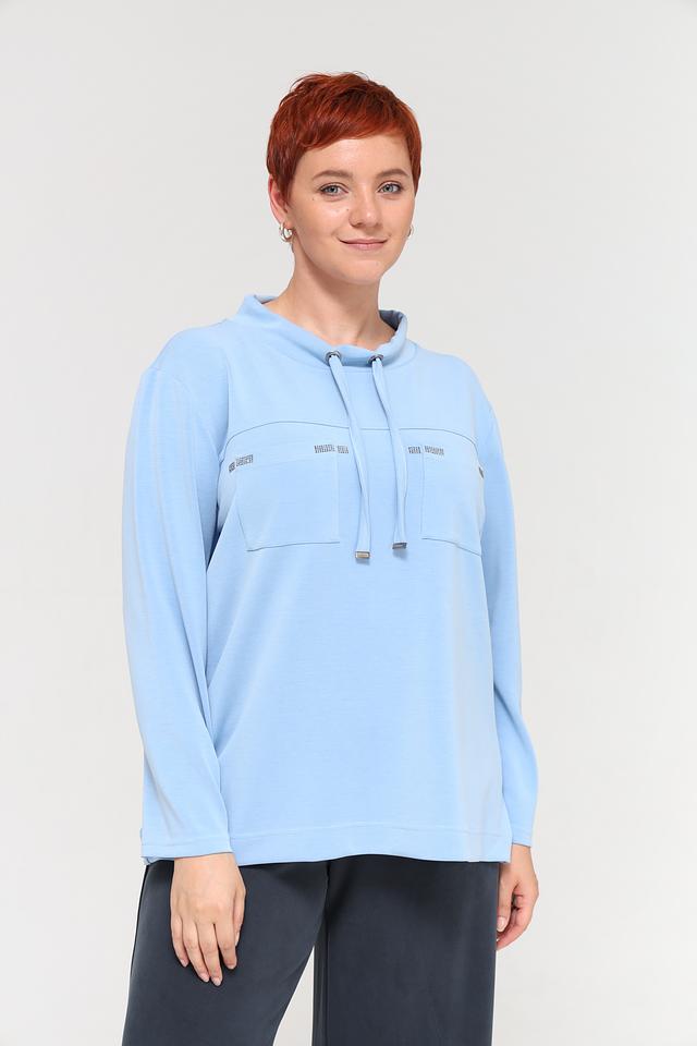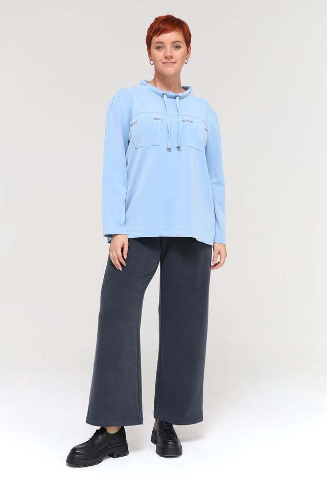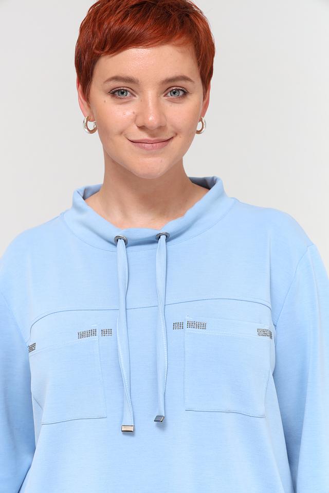 Женский пуловер Doris Streich голубого цвета с накладными карманами и капюшоном на шнурке. Модель выполнена из мягкого и приятного к телу трикотажа, обеспечивающего комфорт в носке. Состав: полиэстер 45%, модал 45%, эластан 10%