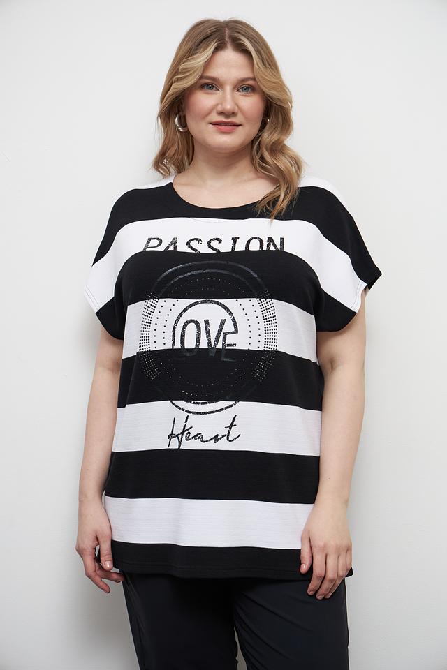 Футболка имеет свободный крой, заниженную линию плеч и короткие рукава, что обеспечивает комфорт и свободу движений. На передней части футболки расположен яркий принт с надписями "PASSION" и "LOVE Heart", выполненный в контрастных цветах.