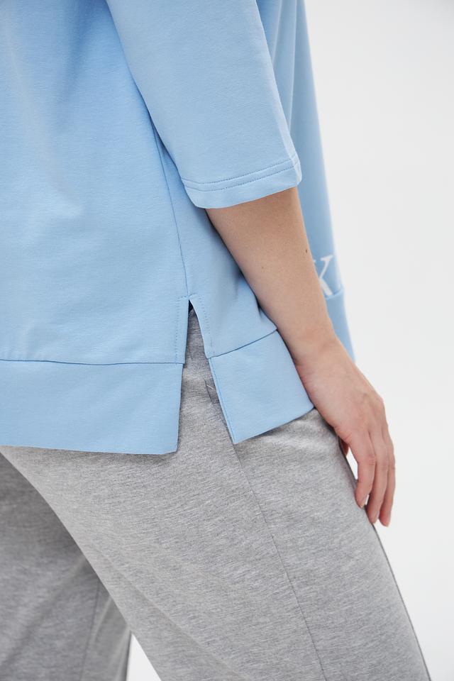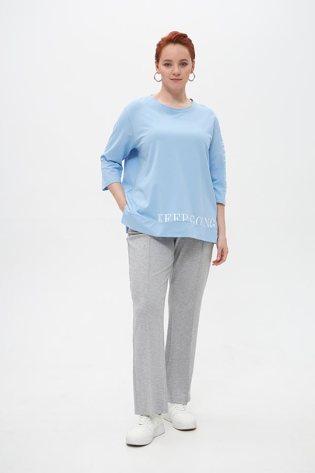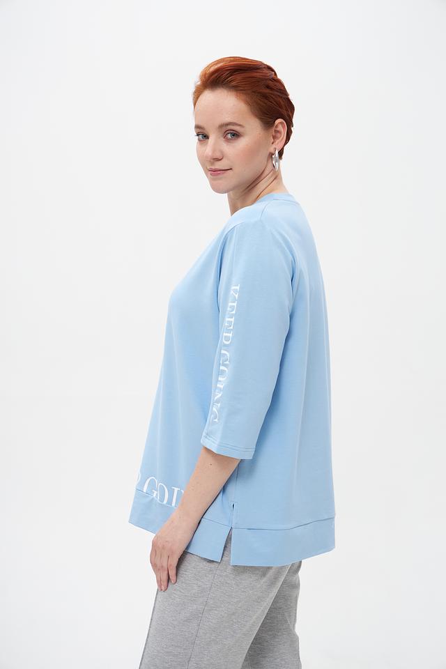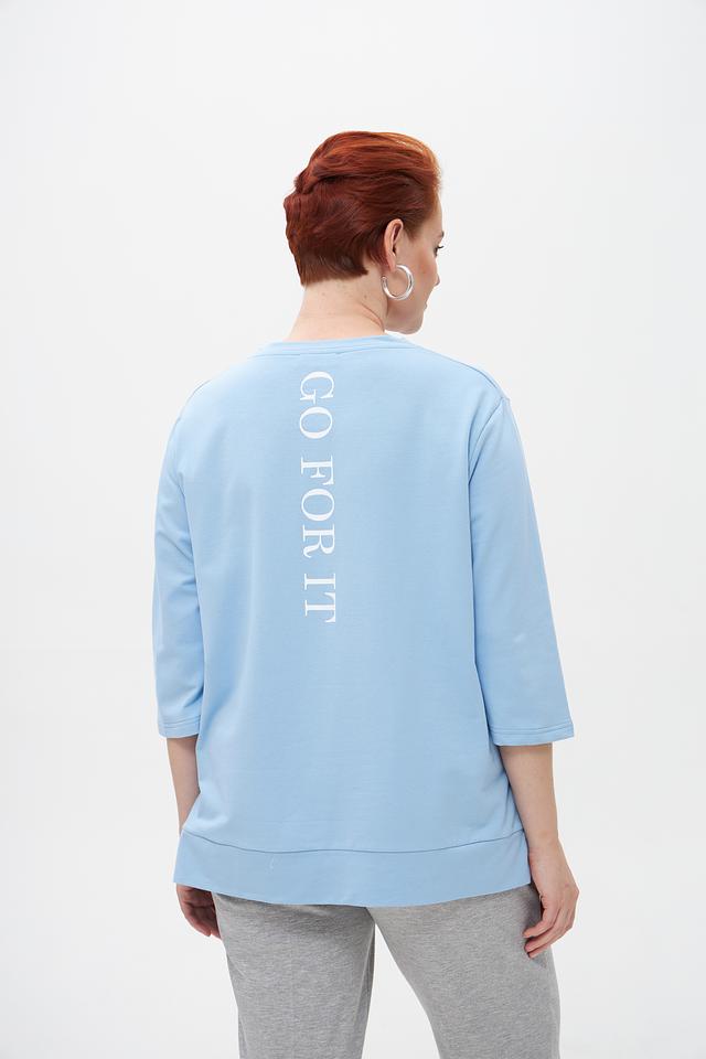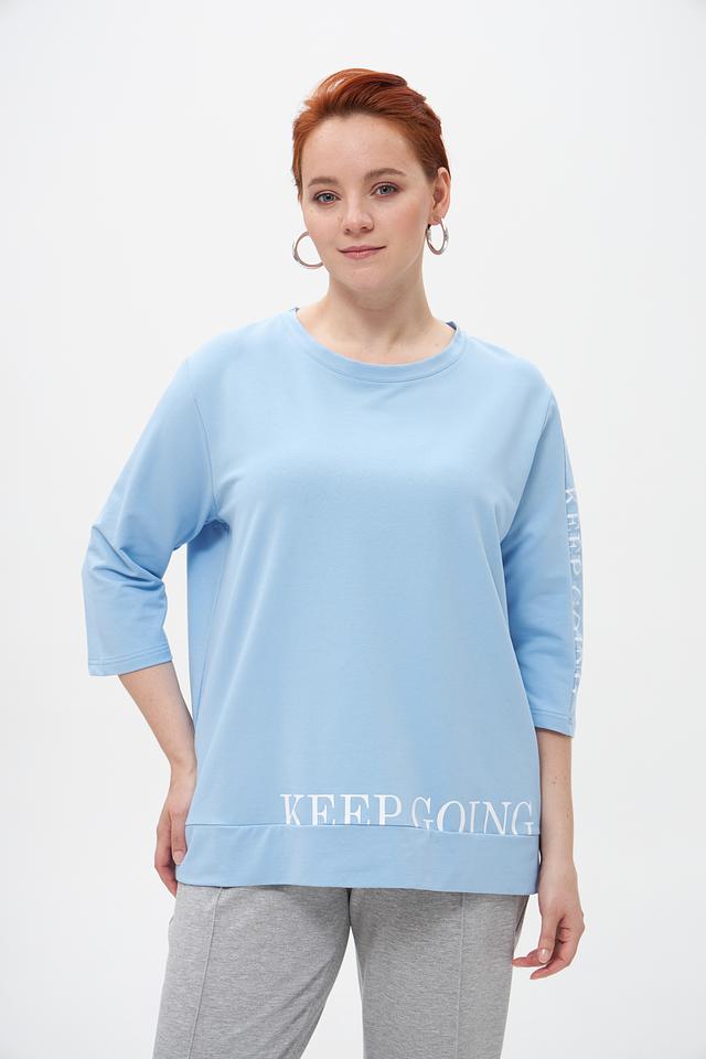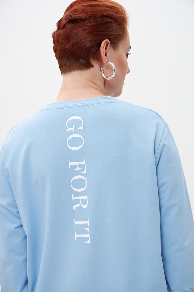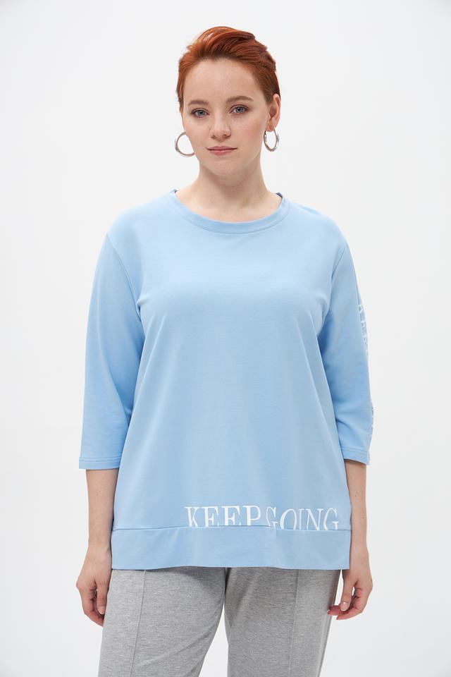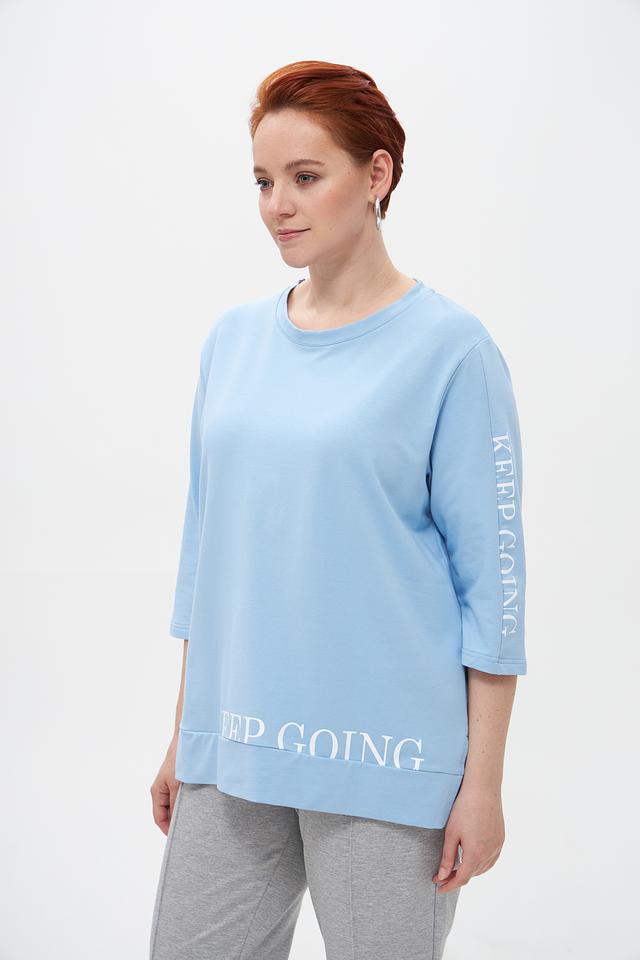 Пуловер имеет короткий рукав 3/4 и округлый вырез горловины. На передней части изделия расположен контрастный белый принт с надписью “KEEP GOING”, а на рукавах и спине – вертикальные надписи “KEEP GOING” и “GO FOR IT”.