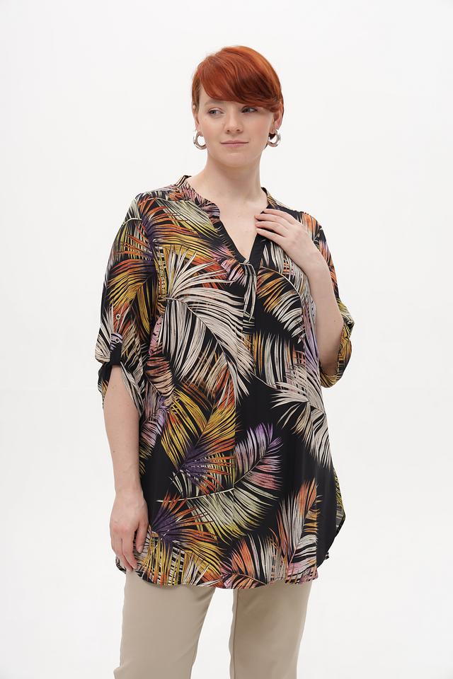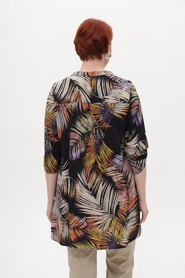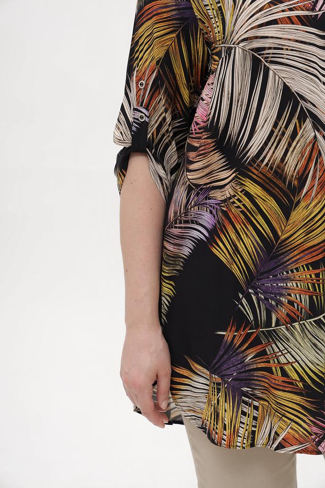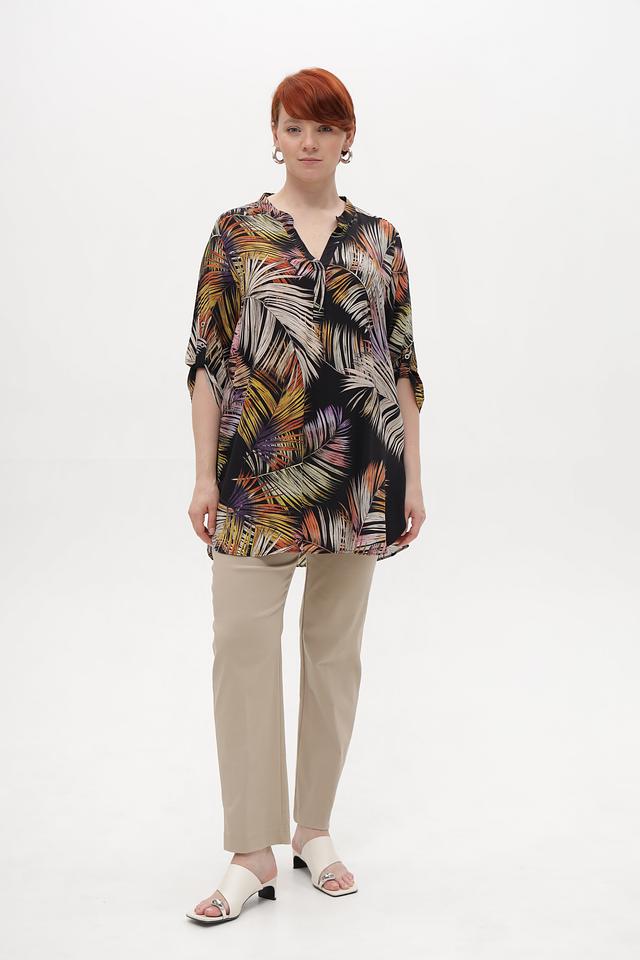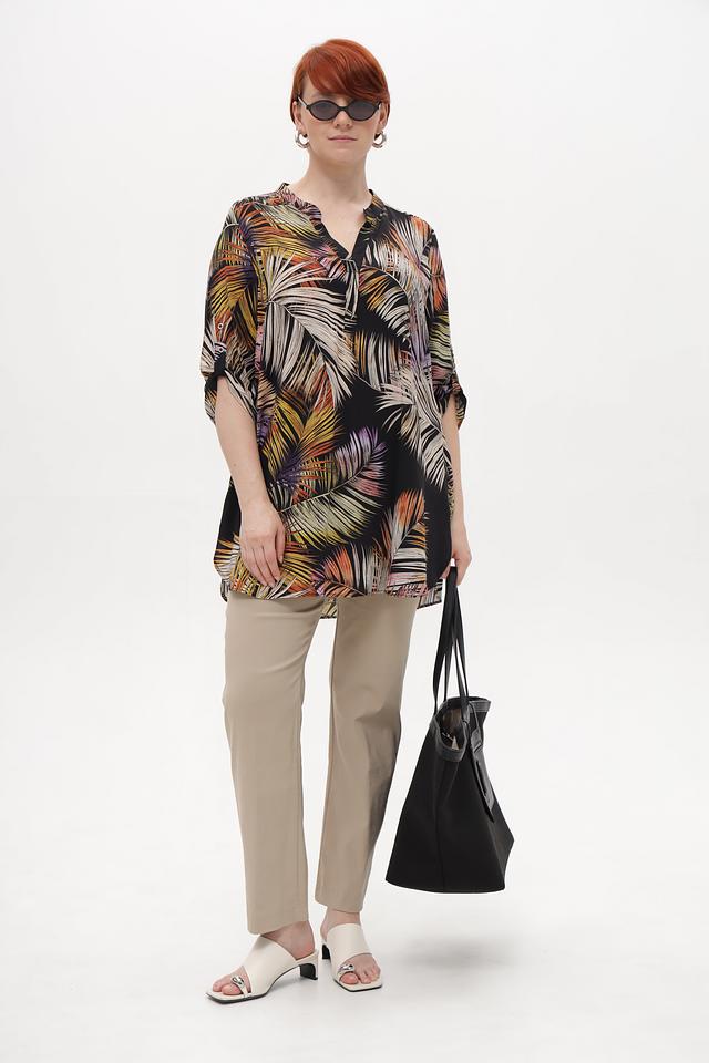 Основным элементом дизайна является яркий тропический принт, который состоит из изображения пальмовых листьев в различных оттенках зелёного, жёлтого, оранжевого и коричневого цветов на чёрном фоне. Эта блузка идеально подходит для создания летних образов и будет отлично сочетаться с брюками, юбками или джинсами.