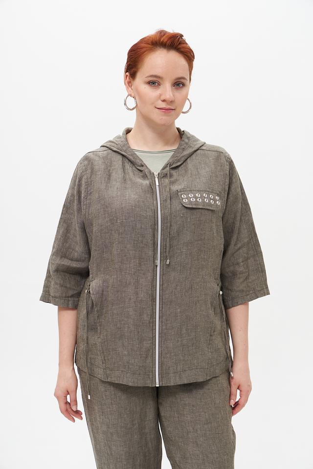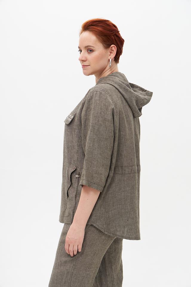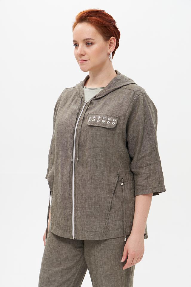 Серый льняной жакет от Doris Streich с капюшоном и застежкой-молнией. Изготовлен из 100% льна, что обеспечивает комфорт и воздухопроницаемость в теплую погоду. Оригинальный дизайн с декоративной отделкой. Состав: лен 100%