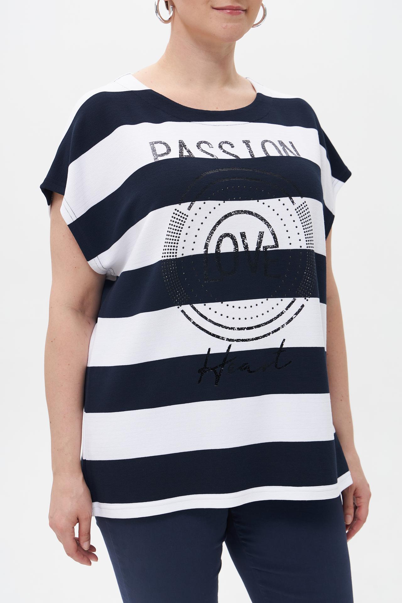 Стильная футболка от Doris Streich в классическую бело-синюю полоску станет незаменимой частью вашего гардероба. Оригинальный принт с надписью "PASSION LOVE HEART" добавляет образу игривости и индивидуальности. Модель свободного кроя с укороченными рукавами обеспечивает максимальный комфорт и свободу движений в течение всего дня.