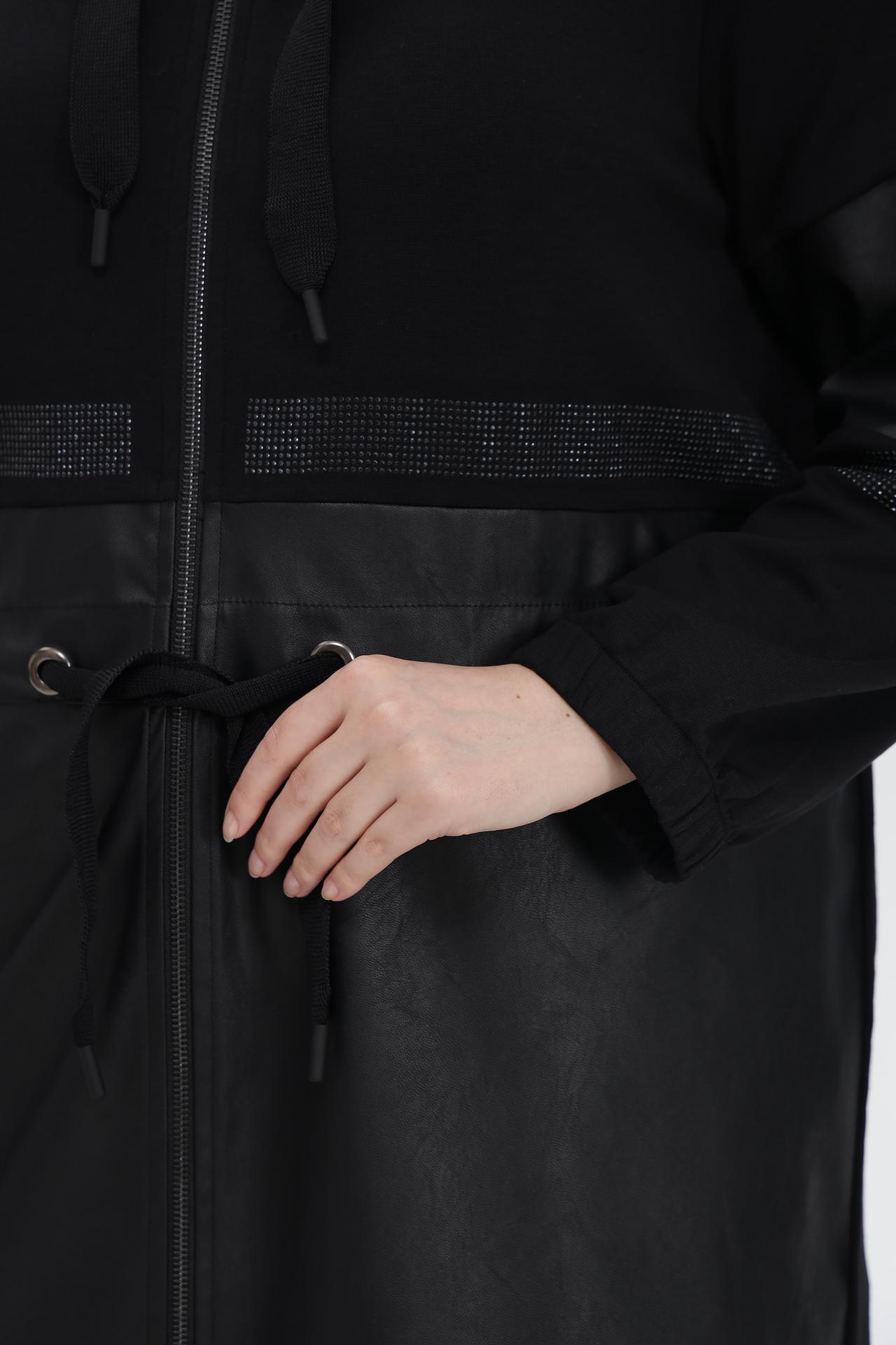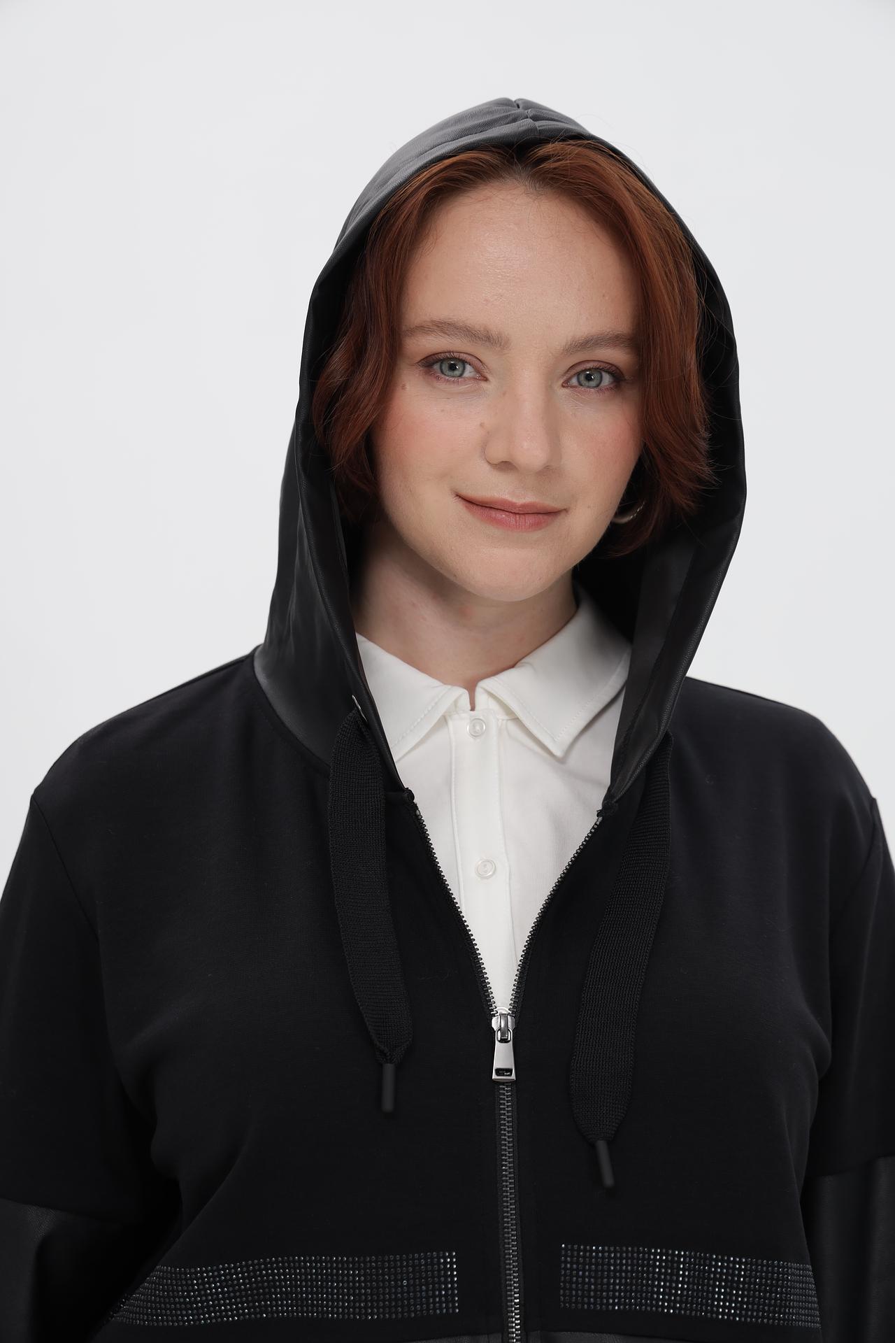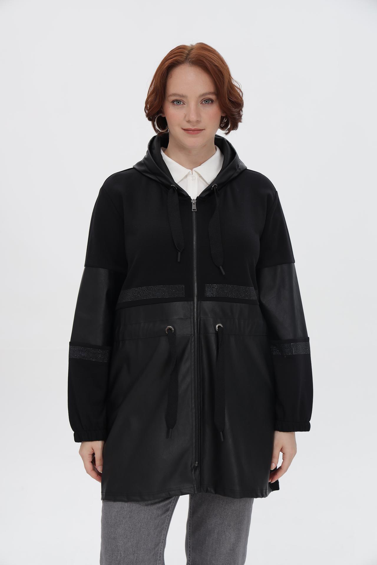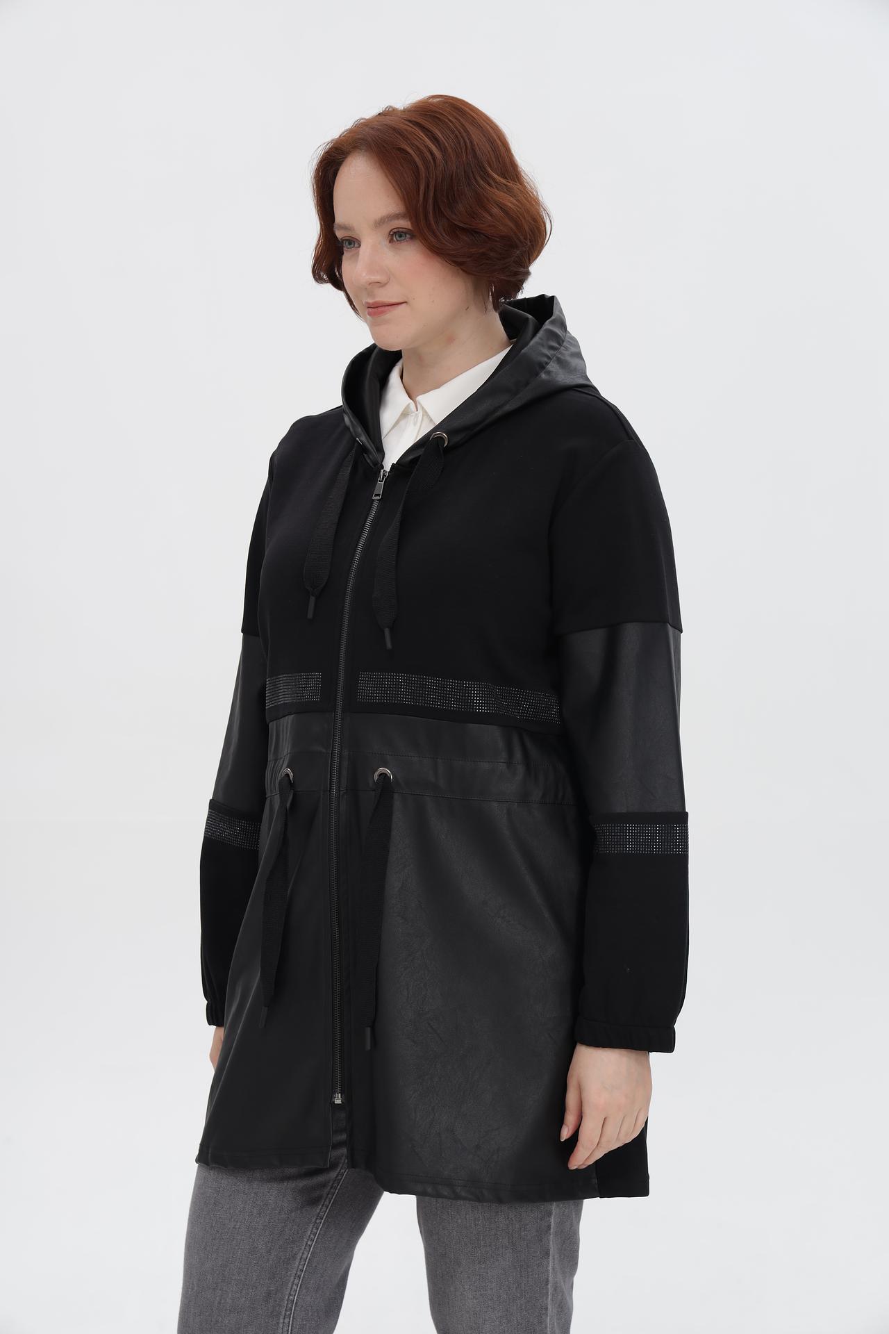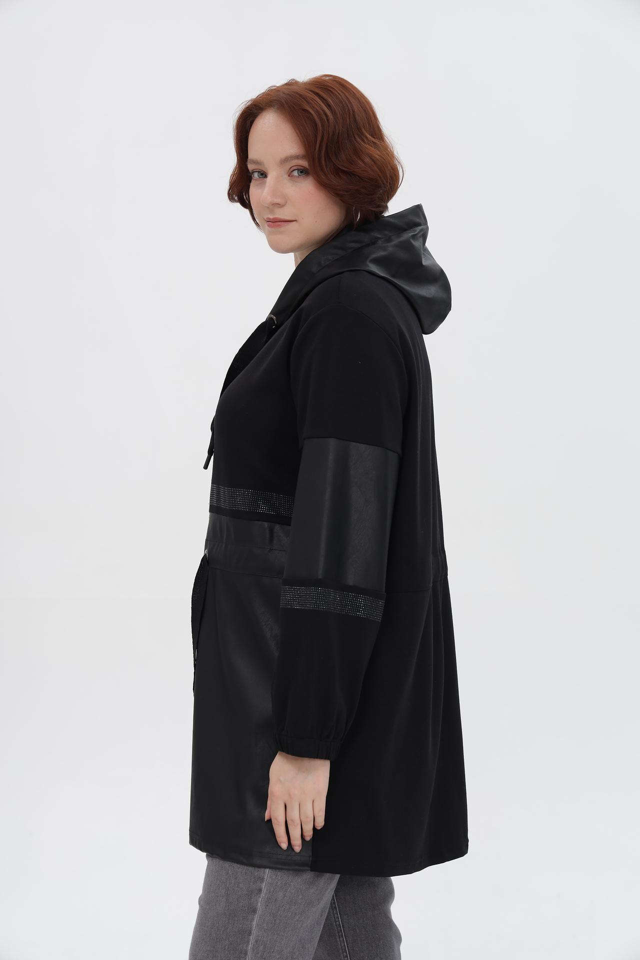 - Дизайн и детали: Модель выполнена в классическом черном цвете и дополнена контрастными вставками из эко-кожи на рукавах и по центру. Декоративная отделка кристаллами на горизонтальных вставках добавляет изысканности и роскоши. Капюшон и кулиска на талии позволяют регулировать посадку.