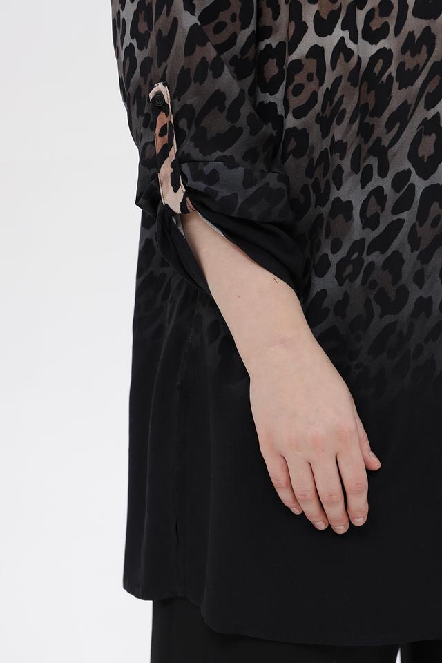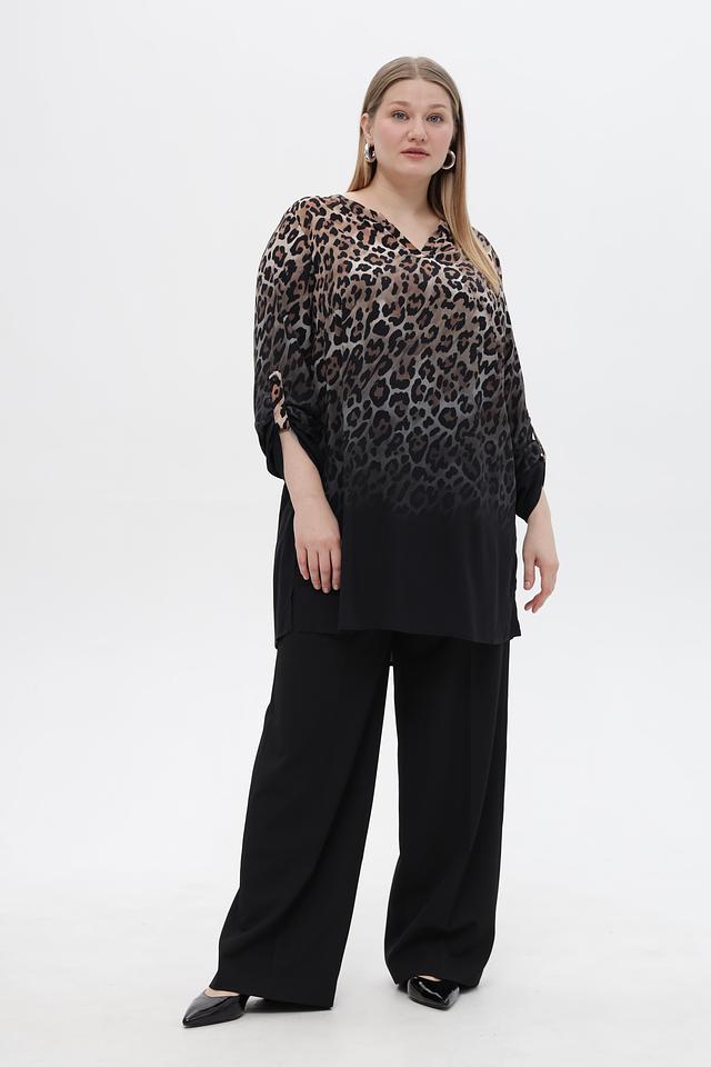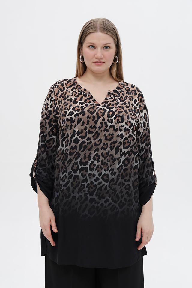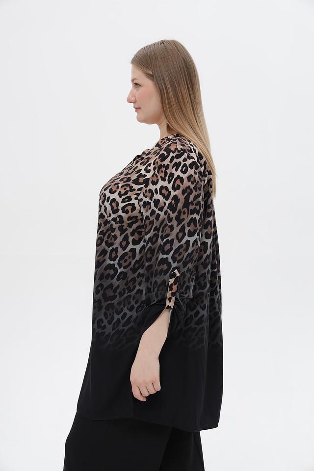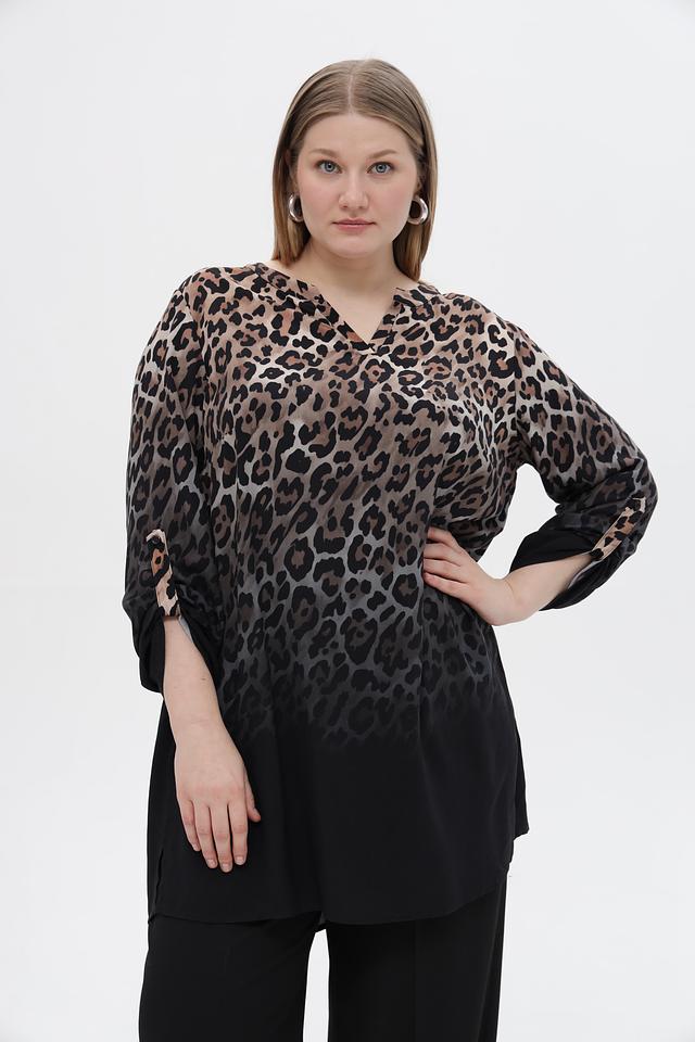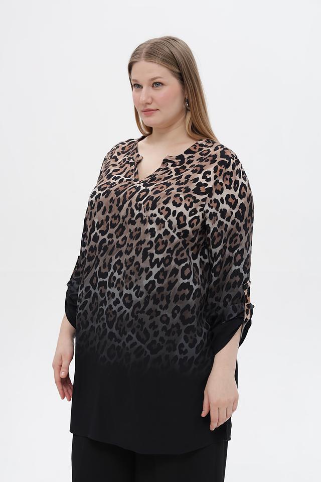Блузка имеет V-образный вырез горловины и рукава три четверти. Нижняя часть блузки выполнена из однотонной ткани черного цвета, создавая эффект многослойности.