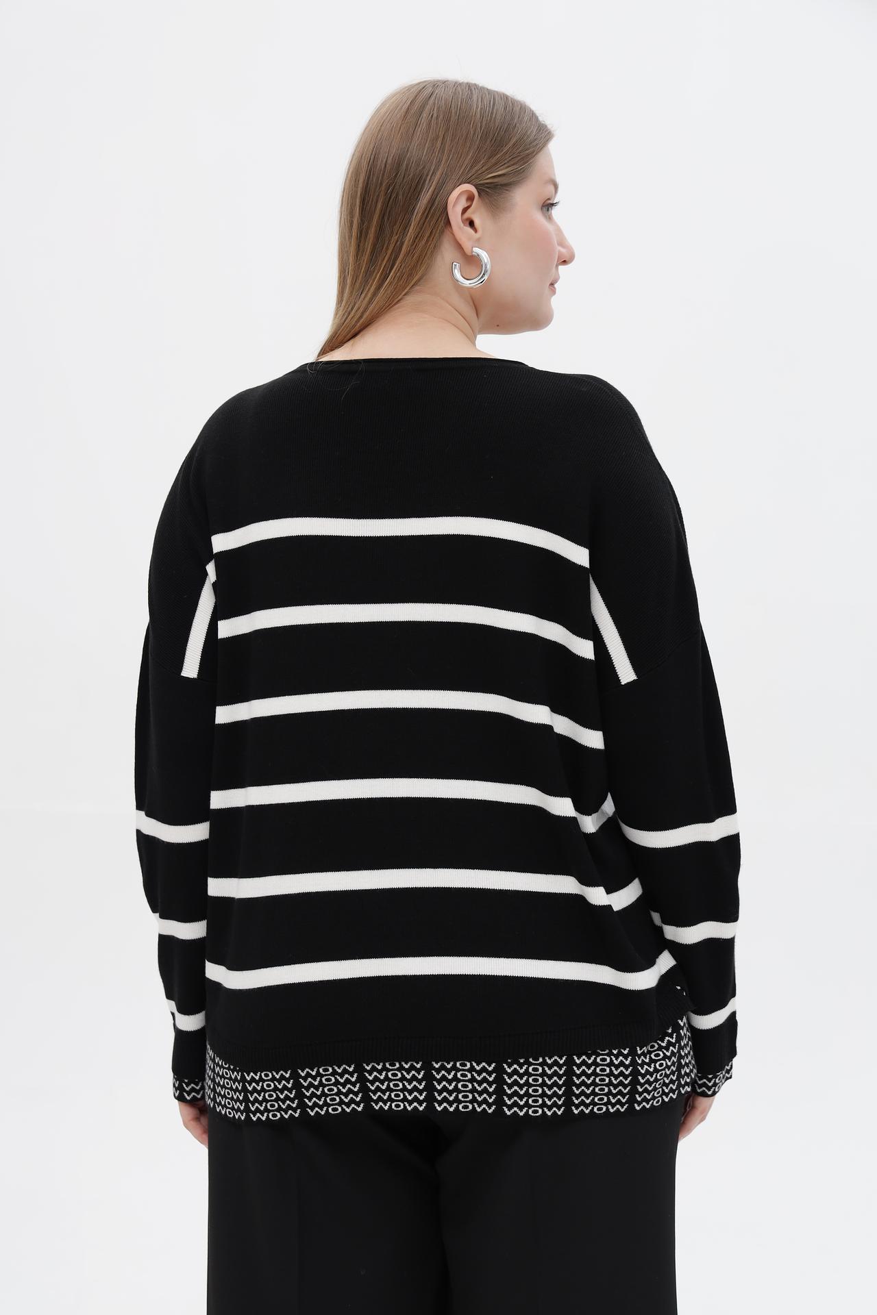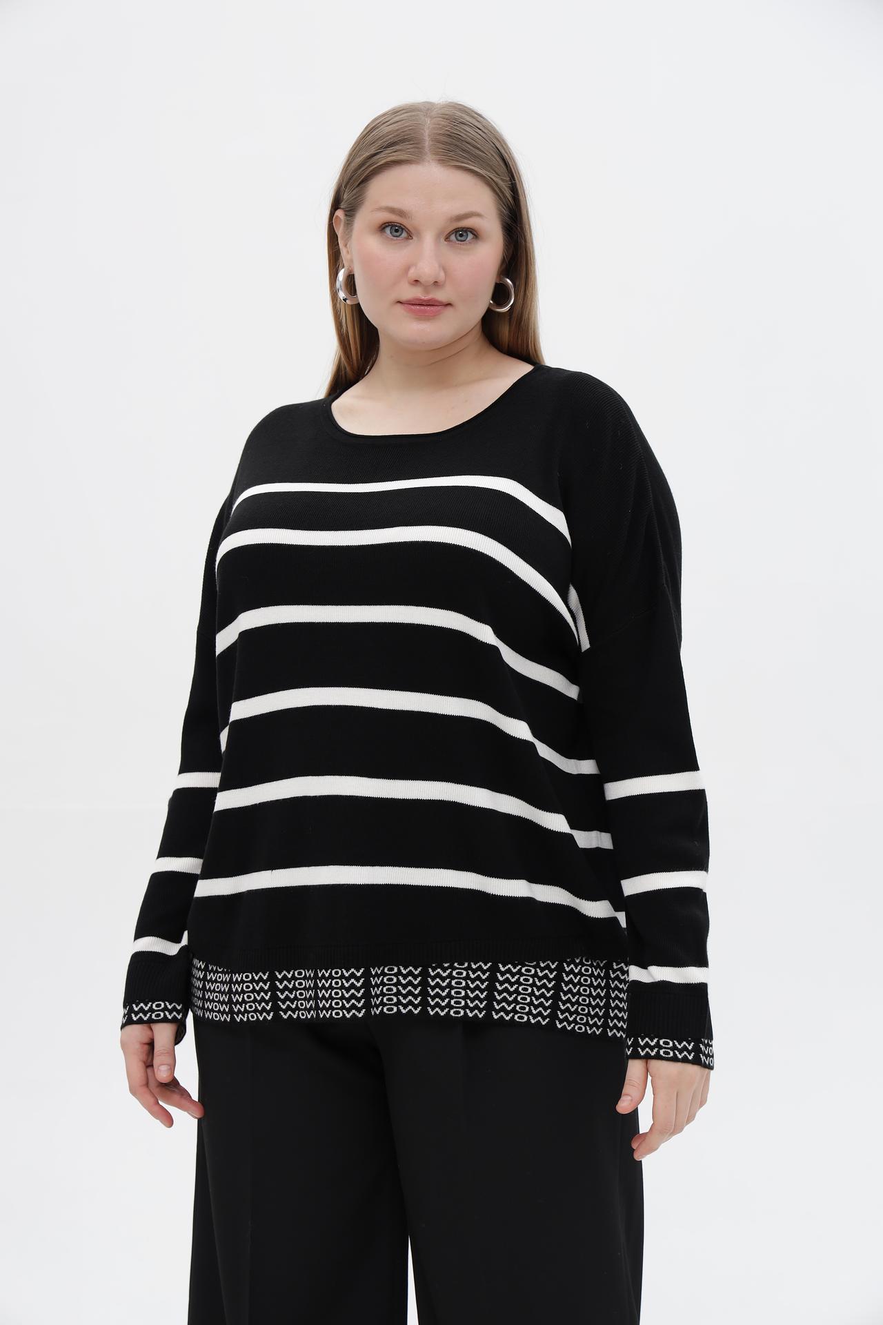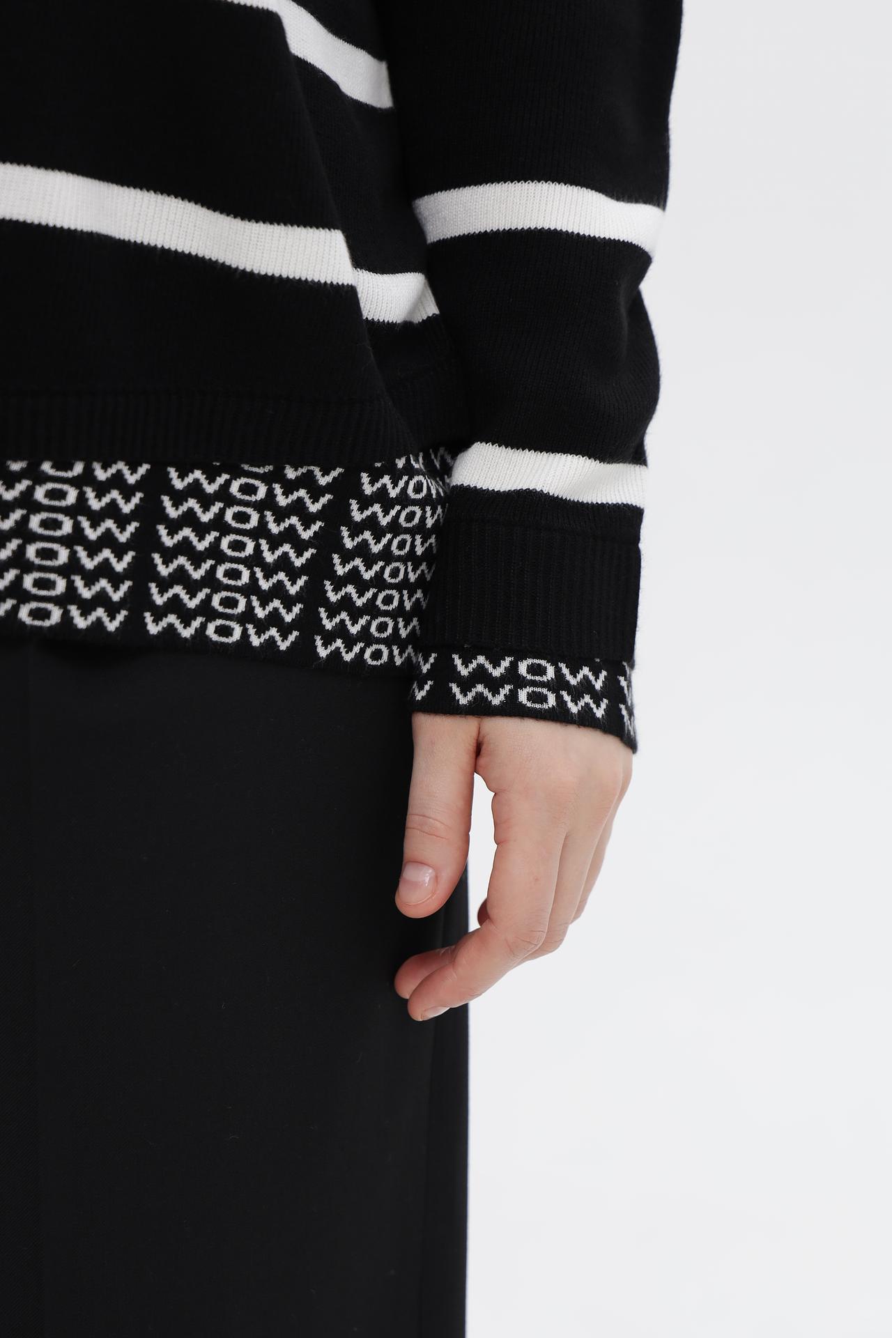 Классический пуловер от Doris Streich, выполненный в элегантном черно-белом дизайне в полоску. Модель украшена оригинальной декоративной отделкой с надписью "WOW" по нижнему краю изделия и на манжетах, добавляя современный акцент.