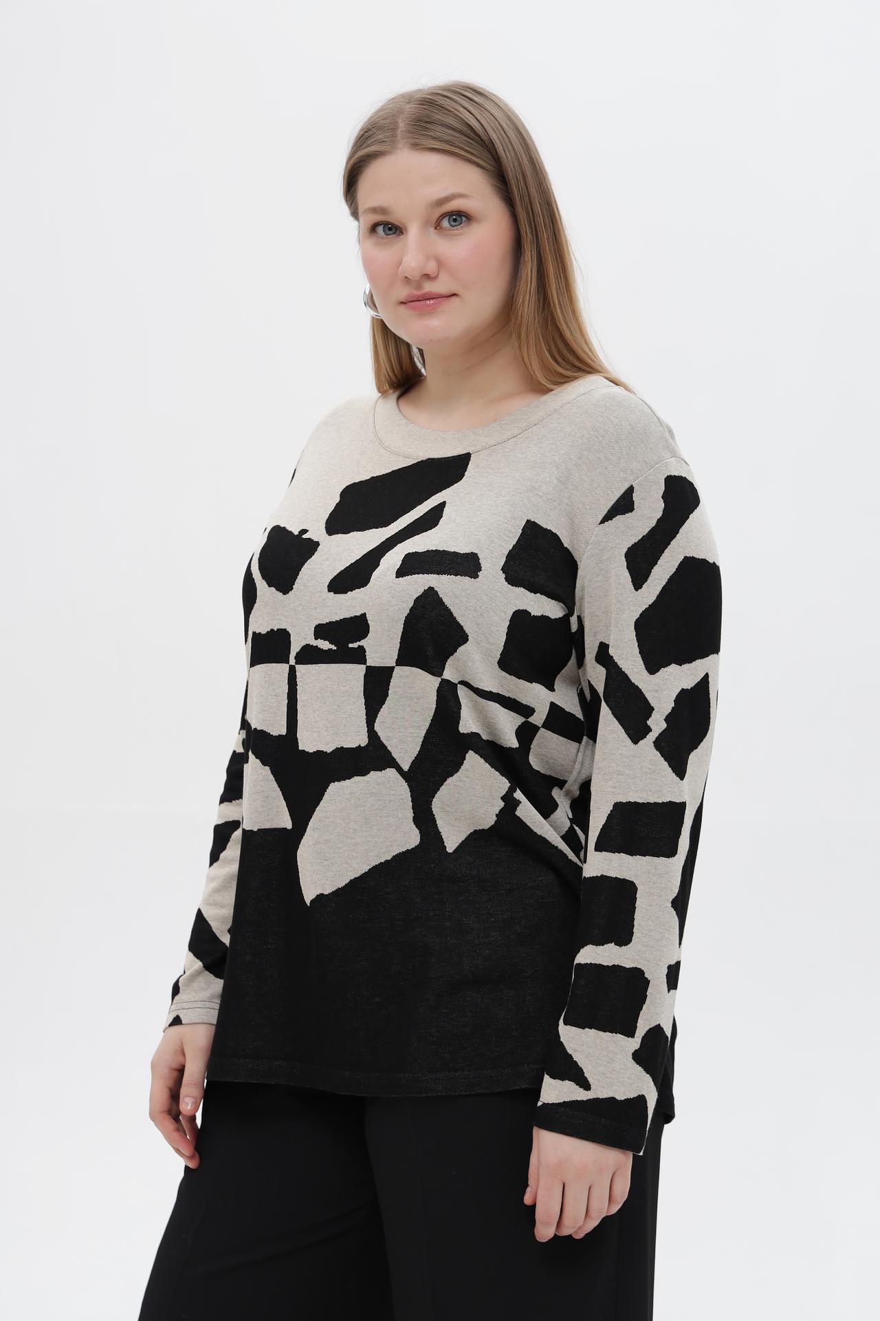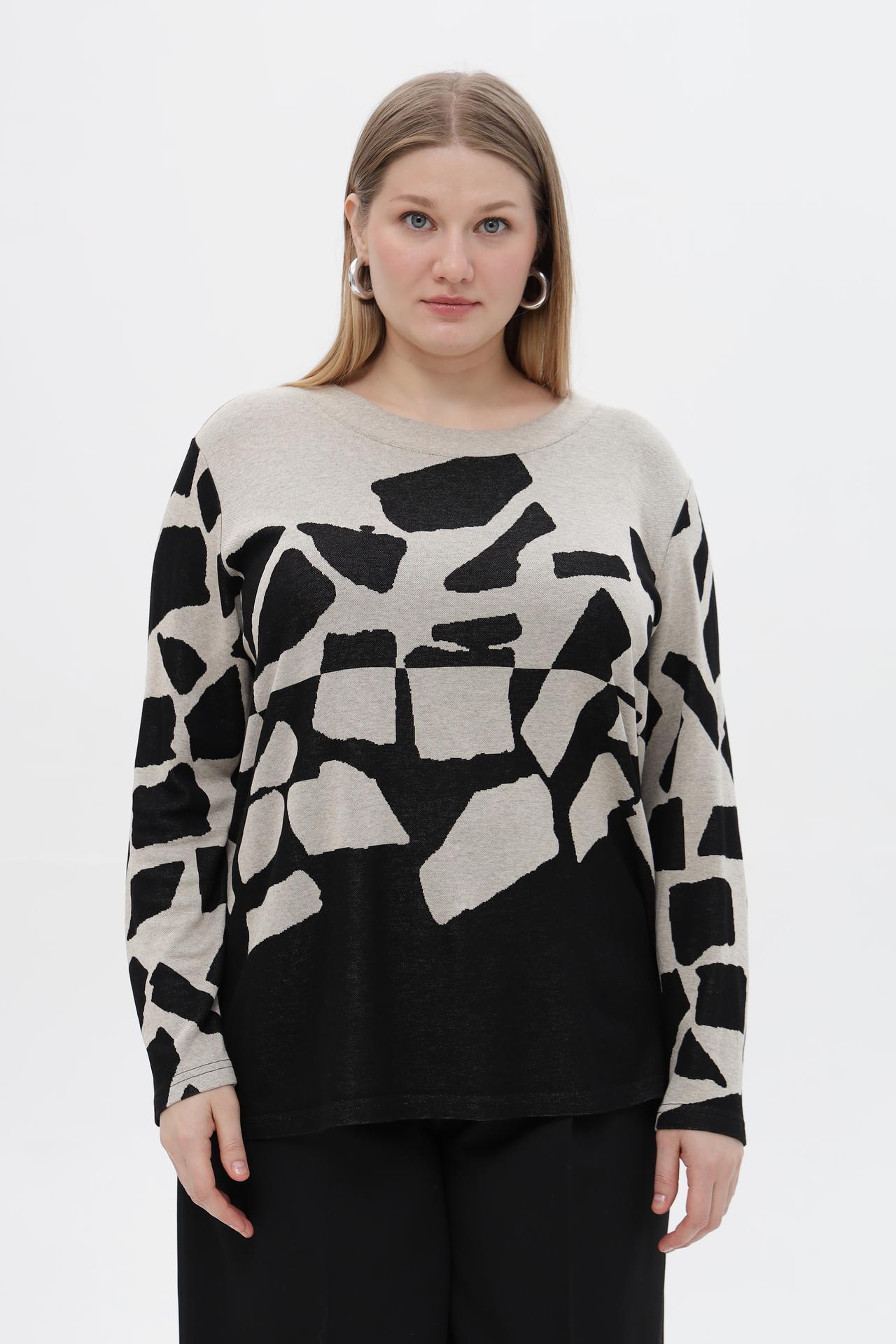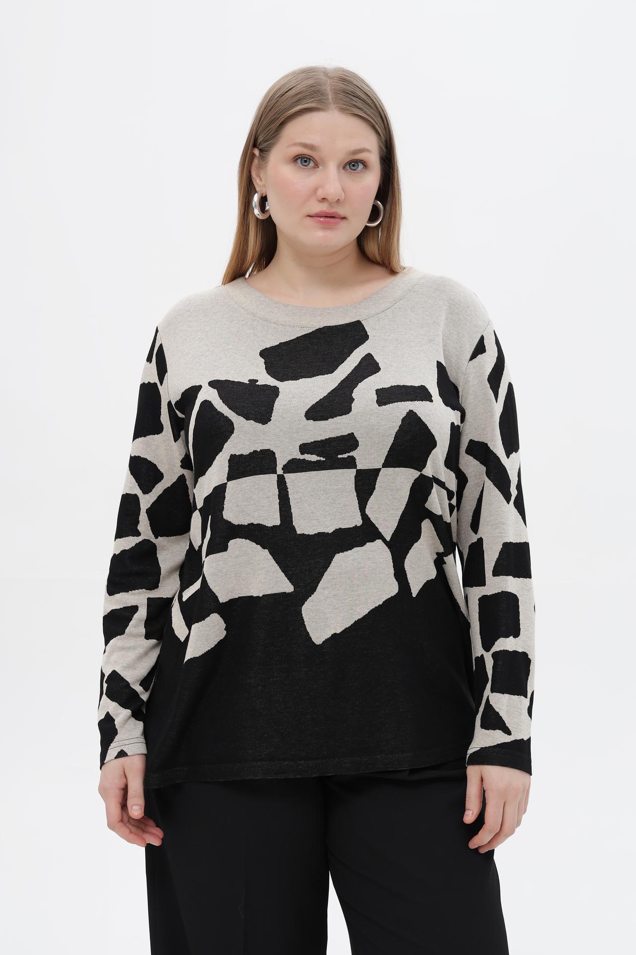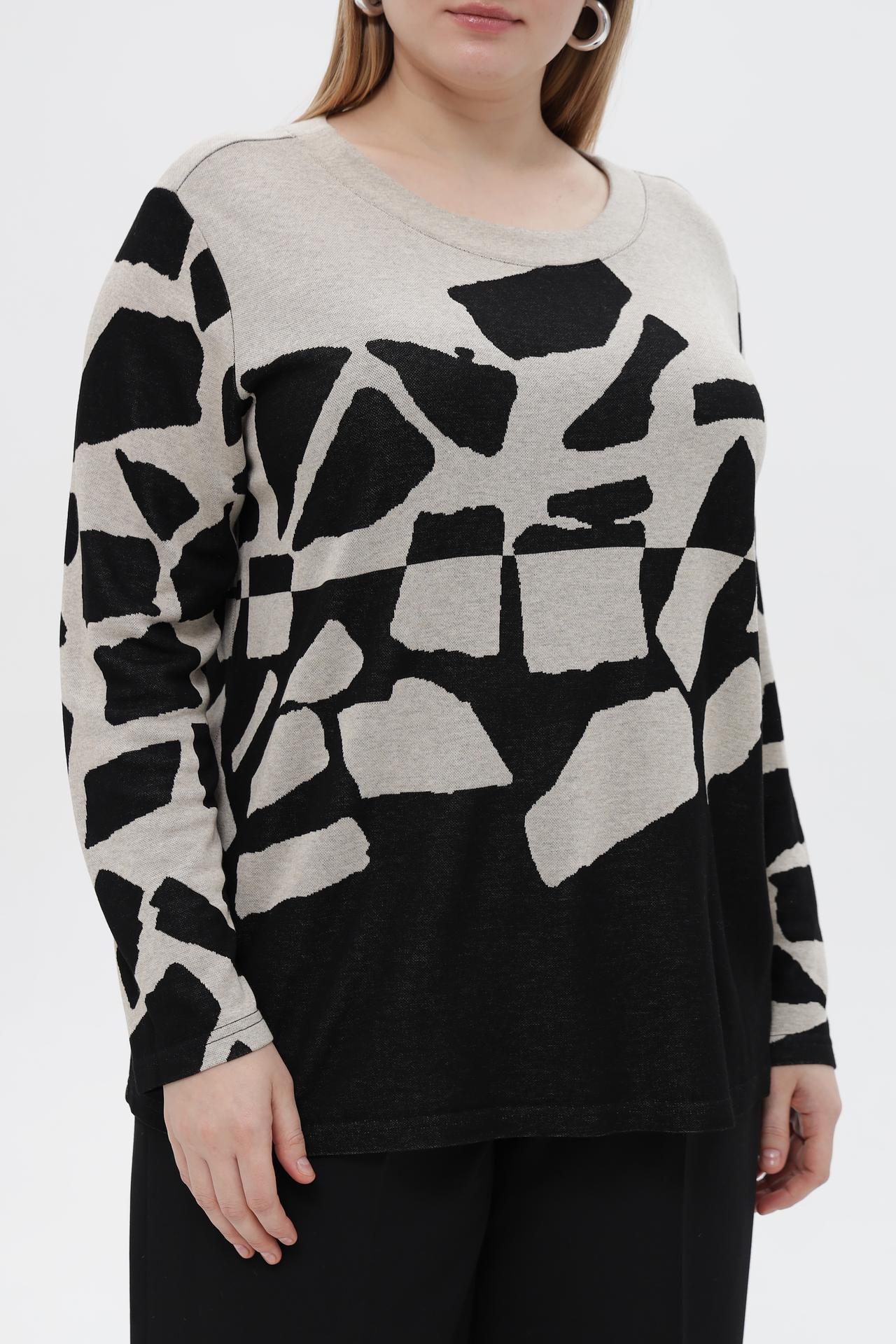 - Дизайн: Модель выполнена в классическом силуэте с длинными рукавами и округлым вырезом горловины. Актуальный принт в виде абстрактных геометрических фигур делает пуловер выразительным и модным.