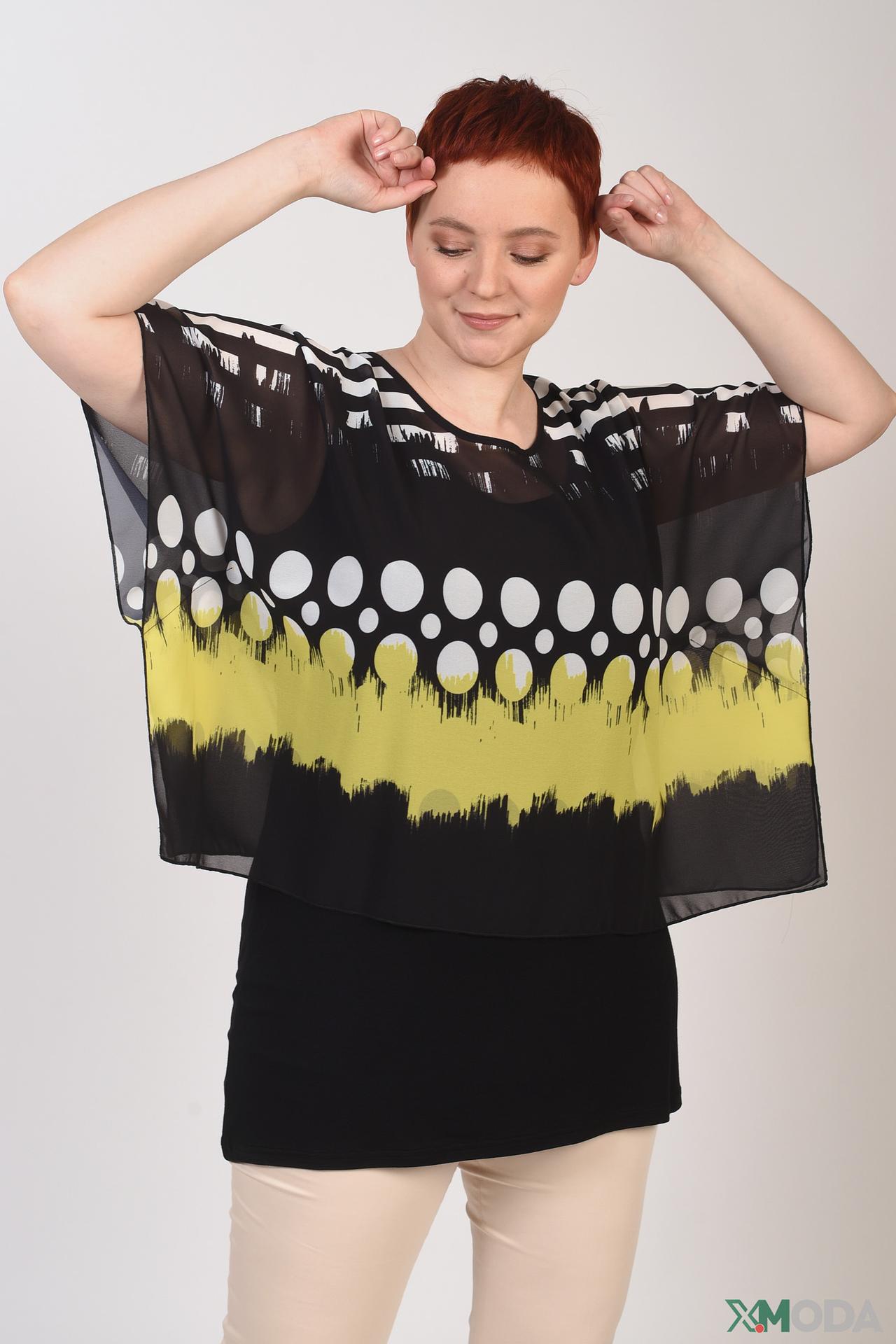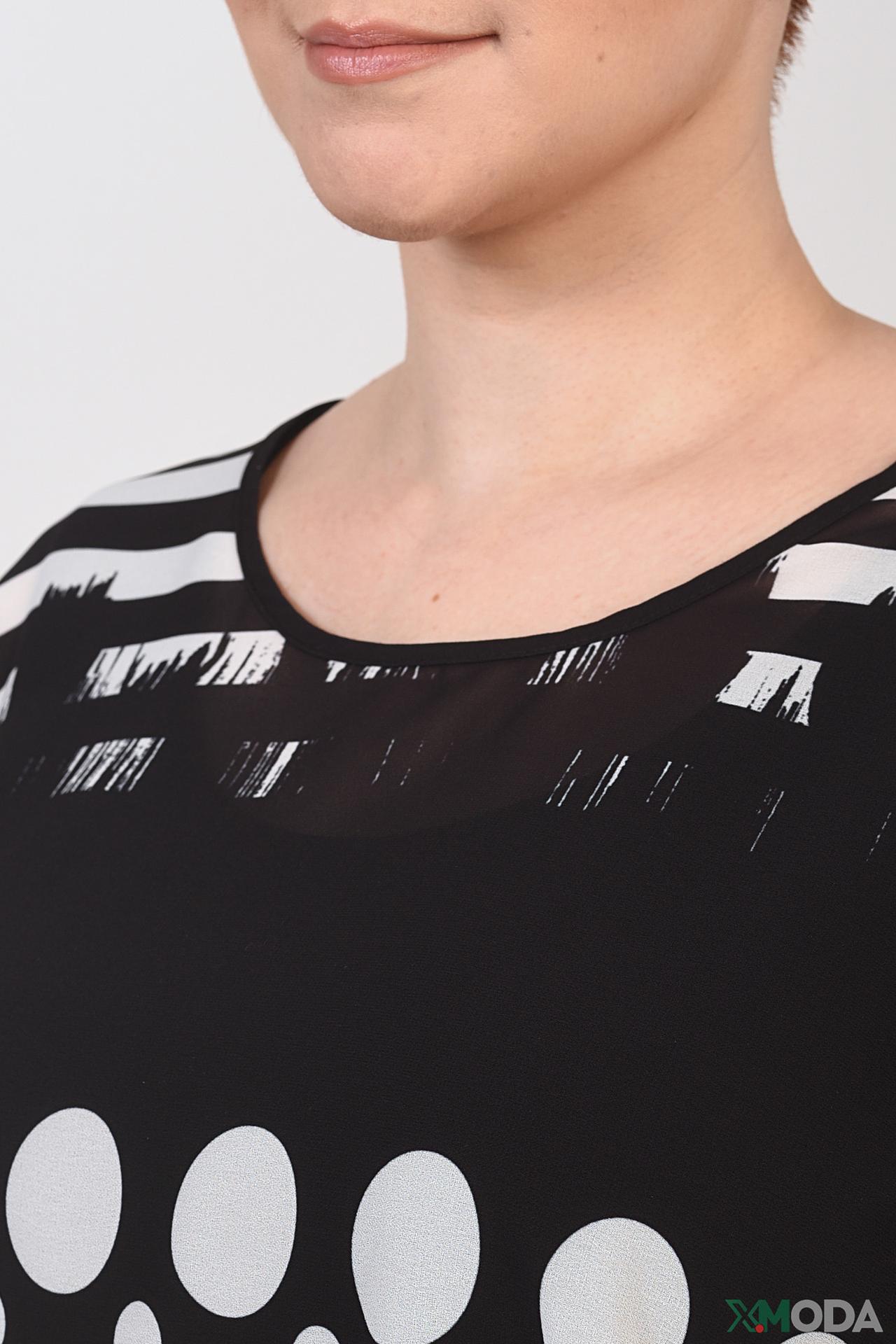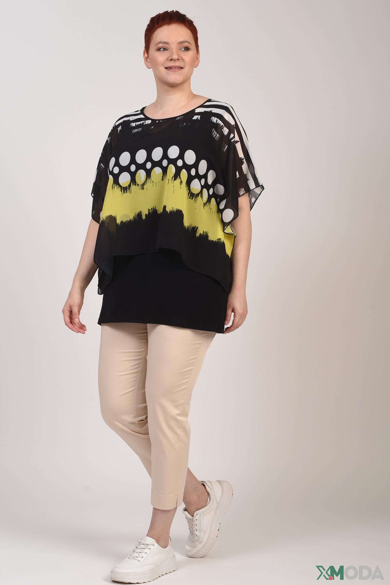 - Дизайн: Блуза украшена абстрактным принтом с элементами полос и кругов, создавая неповторимый стиль. Асимметричный подол и многослойность добавляют изысканности.