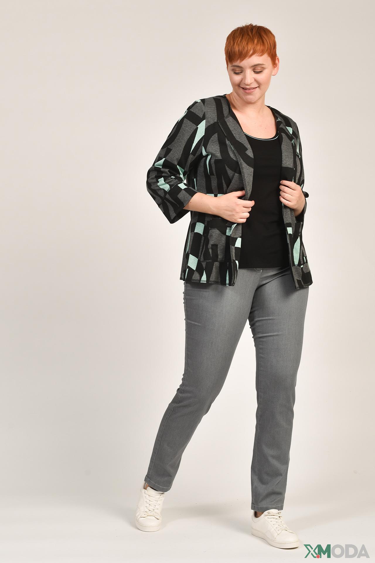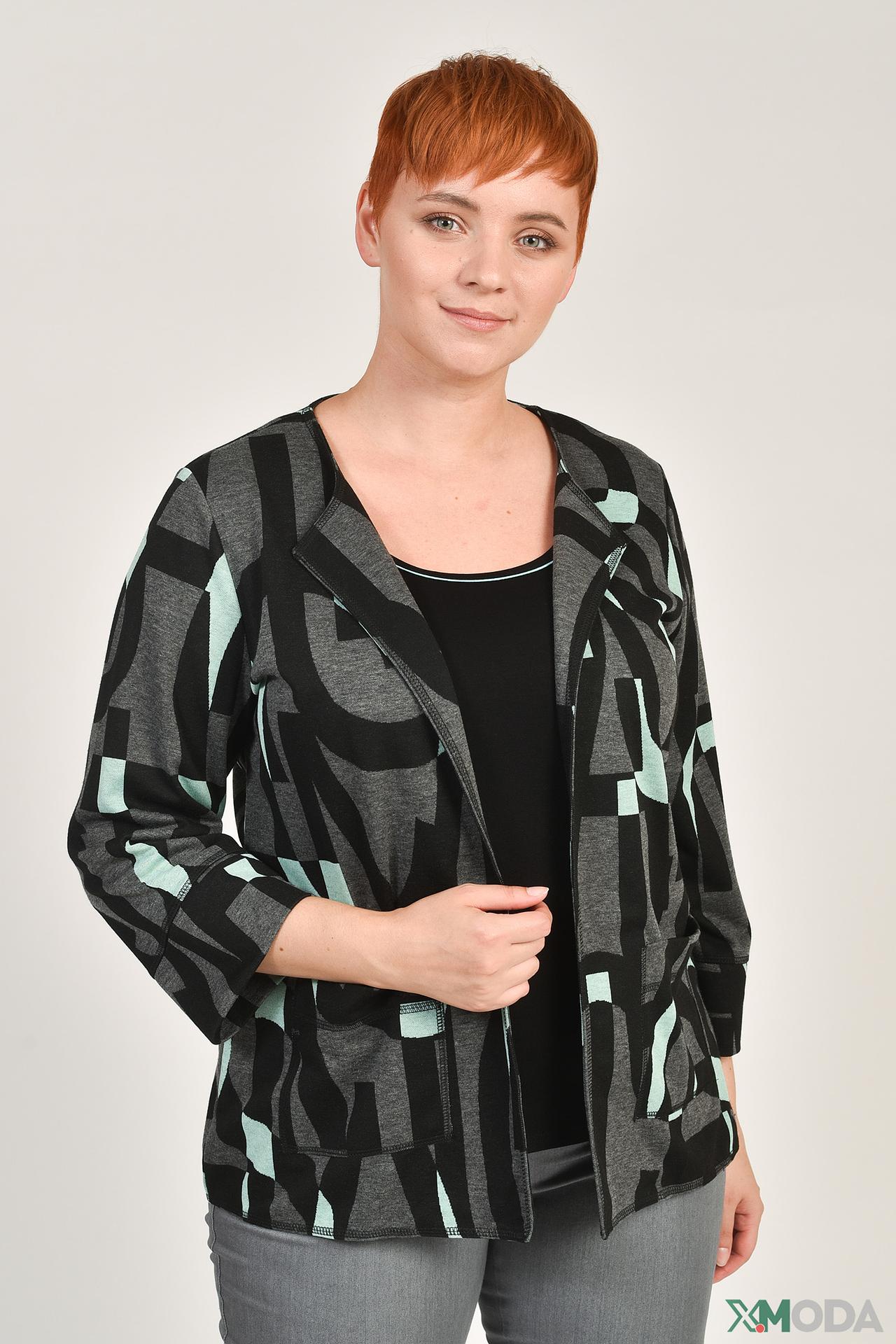 - Дизайн: Жакет выполнен в современном стиле с оригинальным геометрическим принтом, включающим элементы черного, серого и светло-бирюзового цветов. Отсутствие застежек и воротника придает модели непринужденность.