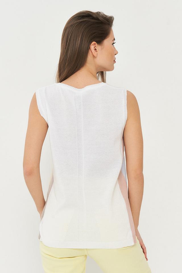 Топ имеет удобный крой без рукавов и круглый вырез, обеспечивающий комфорт в носке. Декоративные полоски голубого, розового и бежевого цветов добавляют оригинальности и свежести. Боковые разрезы придают модели лёгкость и динамичность.