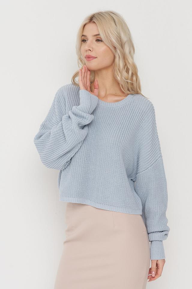Джемпер имеет лаконичный дизайн: круглый вырез горловины, длинные объемные рукава и укороченный крой, который подчеркивает талию. Текстурная вязка придает изделию оригинальность и объем.