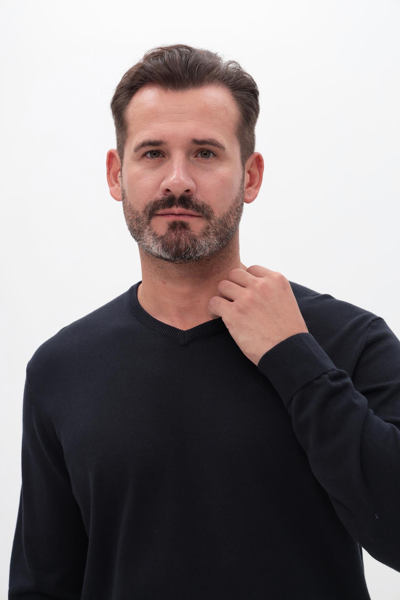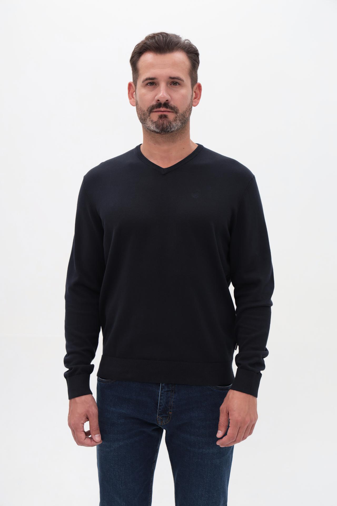 - V-образный вырез: Подчеркивает мужественность и позволяет сочетать джемпер с различными стилями одежды.