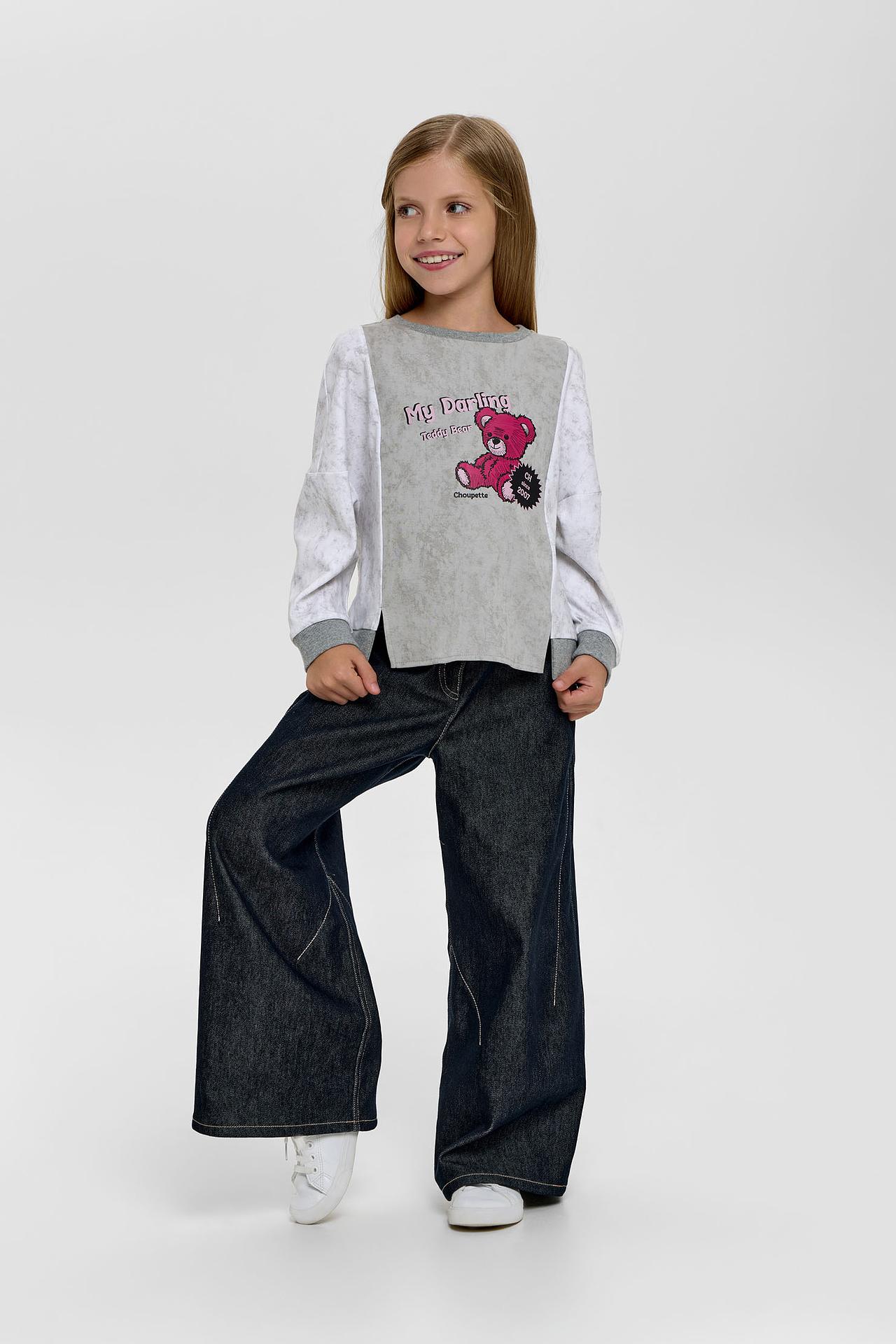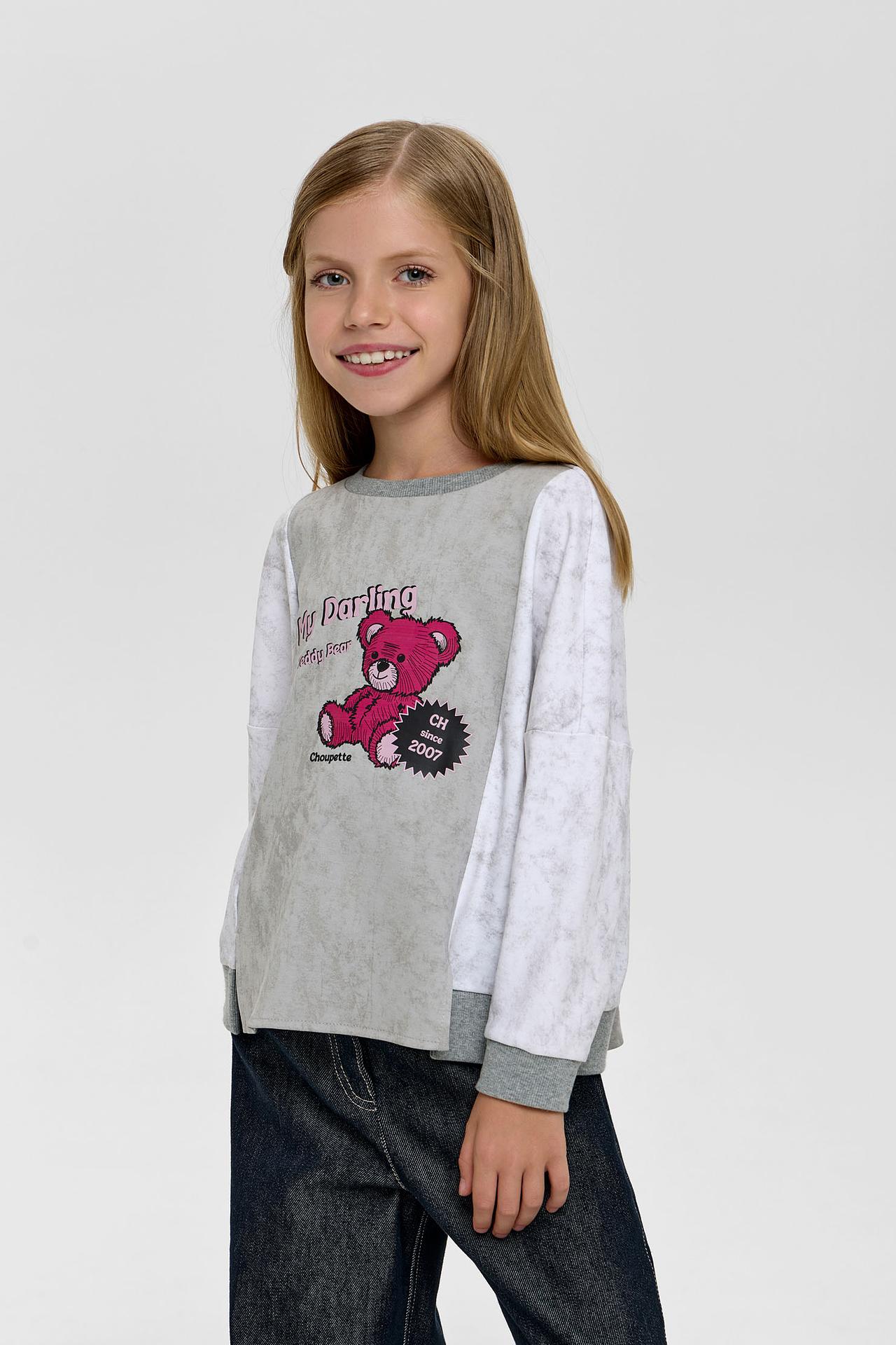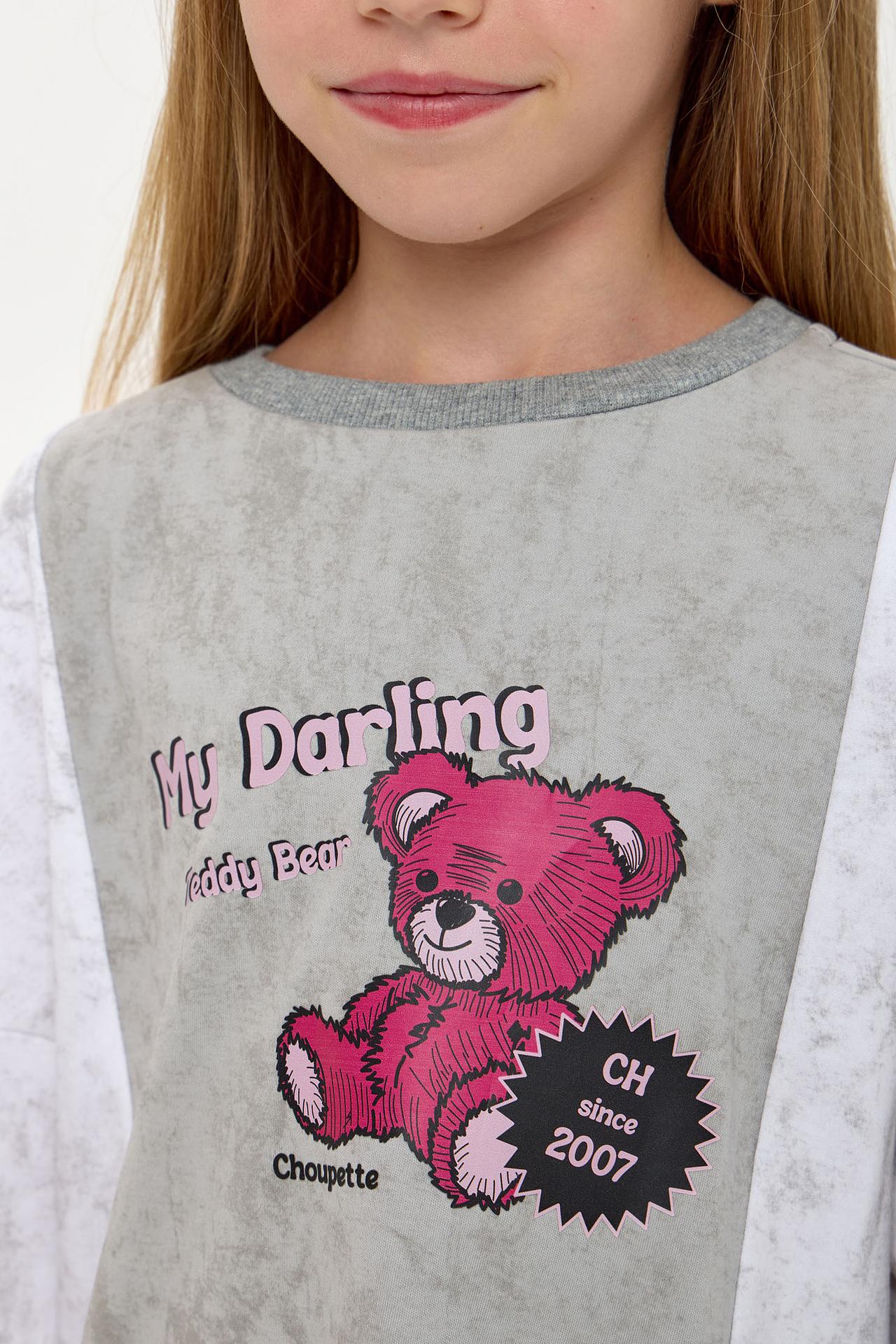 - Дизайн: Комбинирование серой и белой тканей с мраморным принтом, а также аппликация в виде розового мишки с надписью "My Darling Teddy Bear" делают джемпер уникальным.