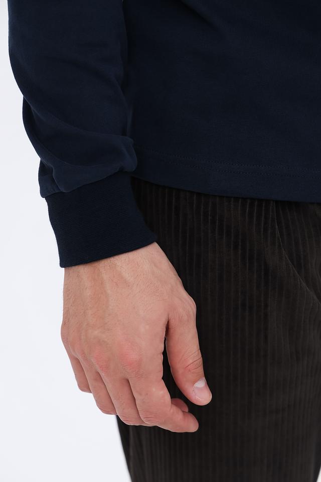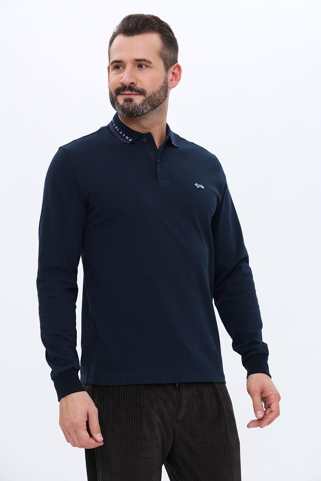 Модель имеет длинные рукава и воротник поло, что делает её универсальным элементом гардероба. На груди расположен небольшой логотип бренда, выполненный в контрастных цветах. Воротник поло дополнен тонкой полоской с логотипом бренда.