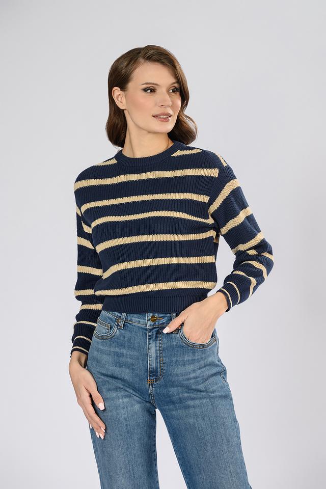Этот стильный джемпер от i Blues выполнен в классическом дизайне с полосатым узором. Преобладающий цвет – navy, который отлично сочетается с бежевыми полосами, создавая элегантный и универсальный образ.