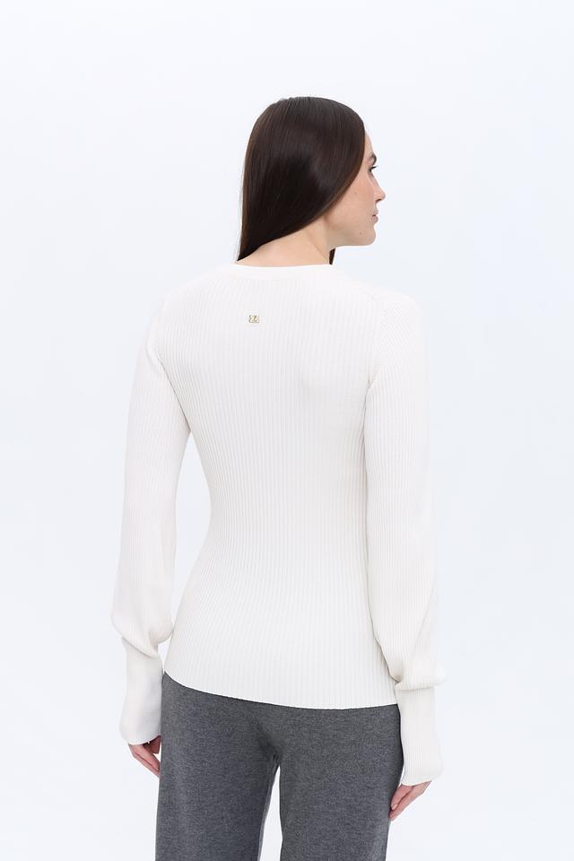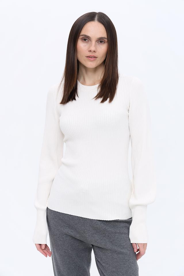 Джемпер имеет классический крой с круглым вырезом горловины и длинными рукавами. Рубчатая текстура придает изделию изысканность и подчеркивает его элегантный стиль. Преобладающий цвет – белый, что делает его универсальным и легко сочетаемым с другими элементами одежды.