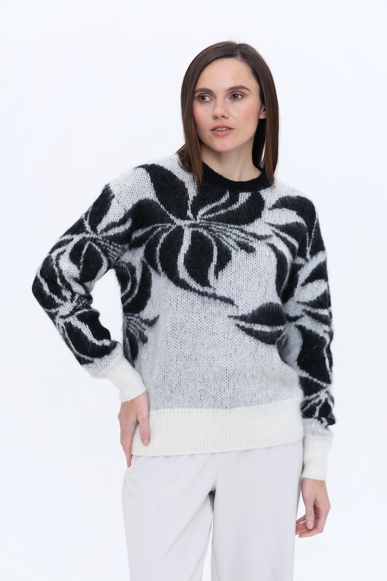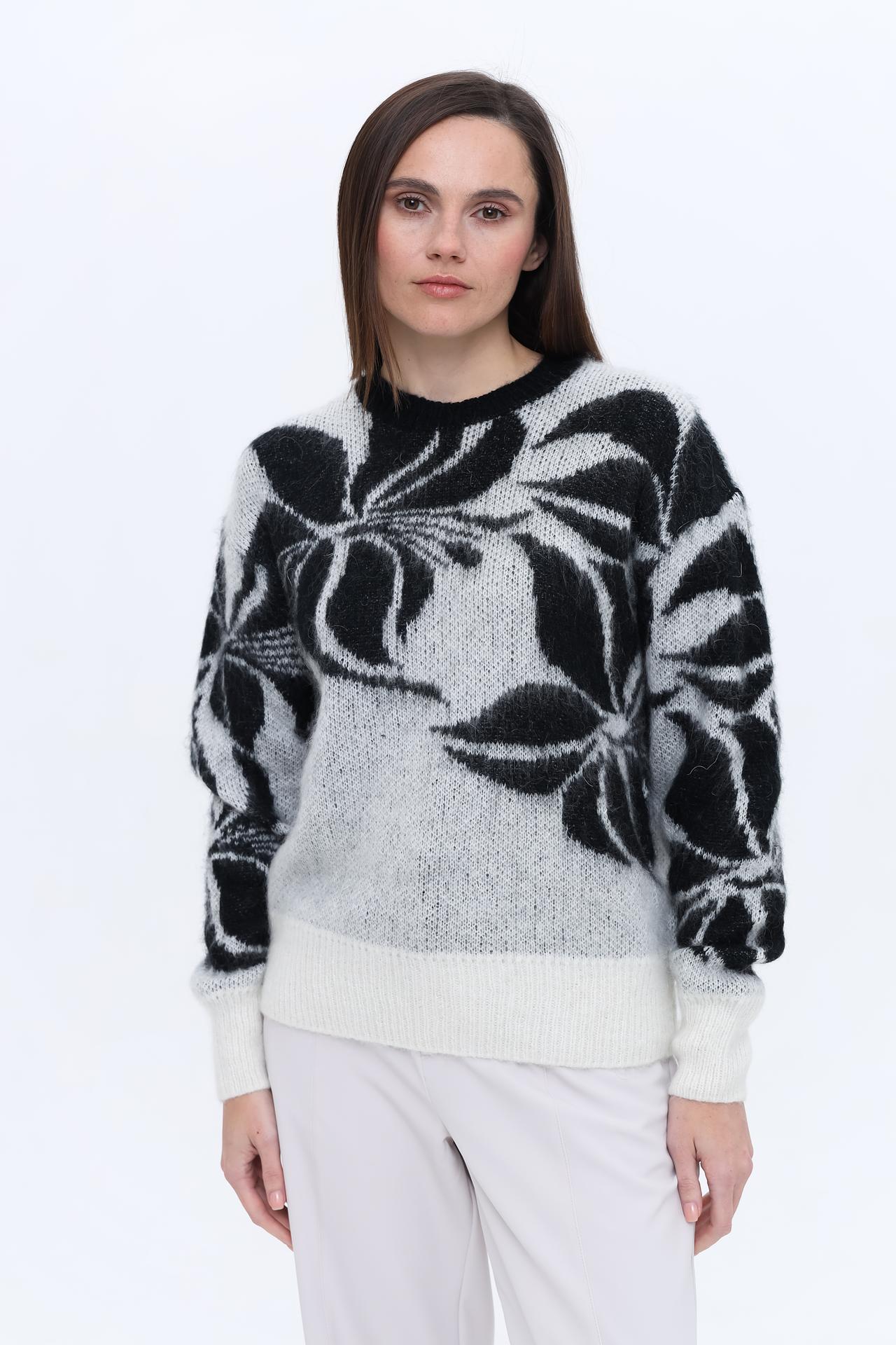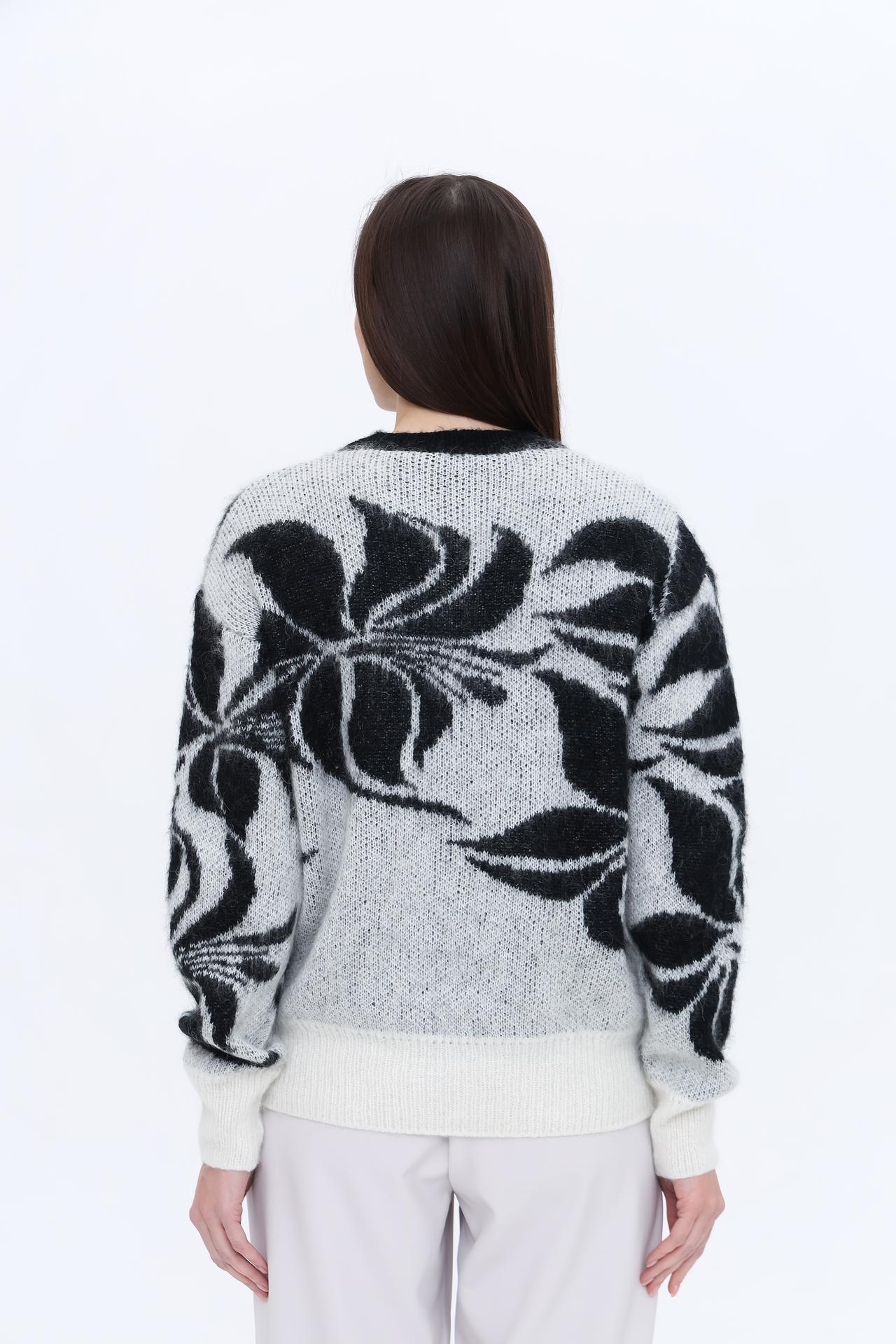 - Дизайн: Стильный черно-белый принт в виде абстрактных цветов, придающий джемперу оригинальности и элегантности.