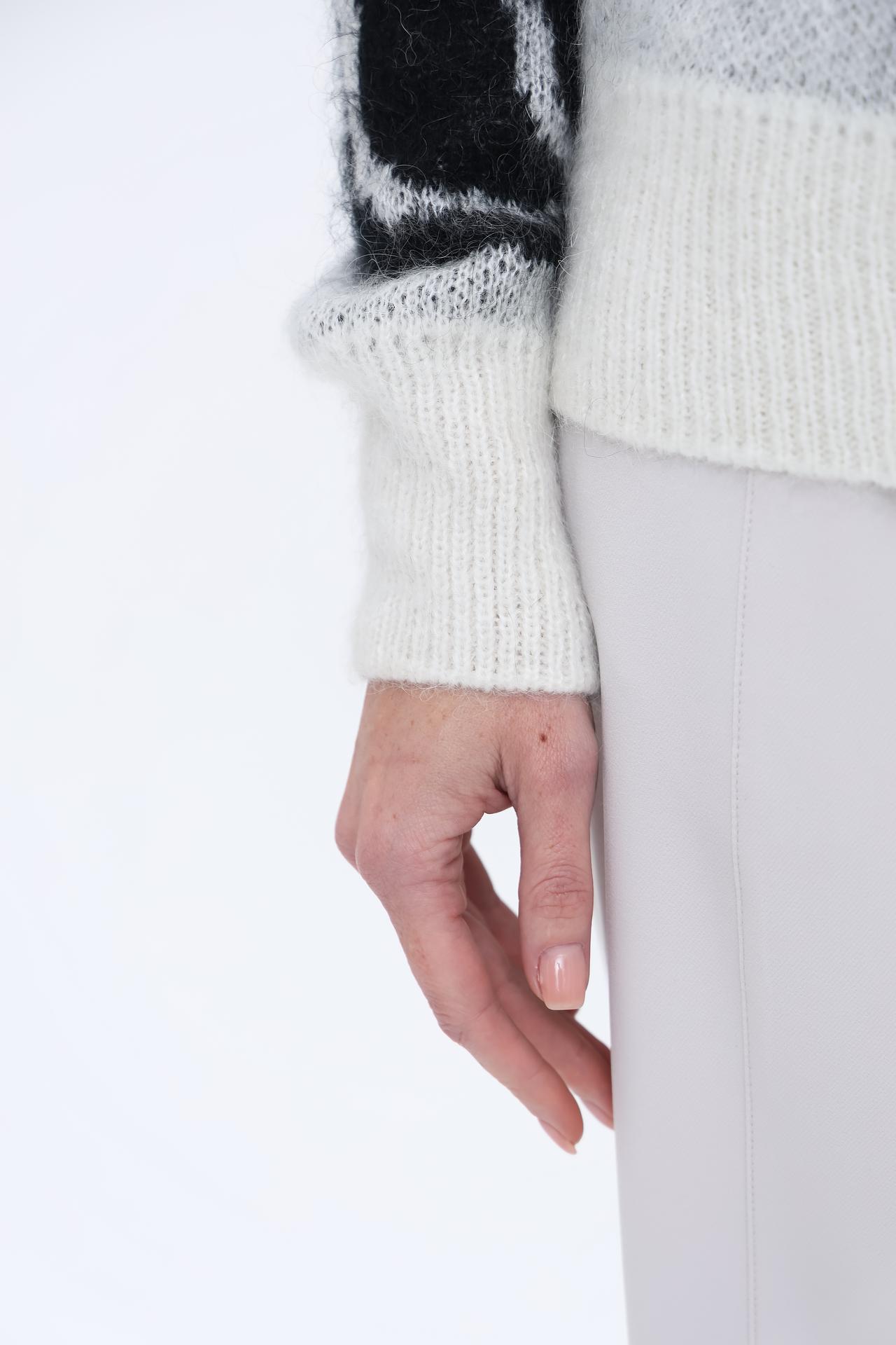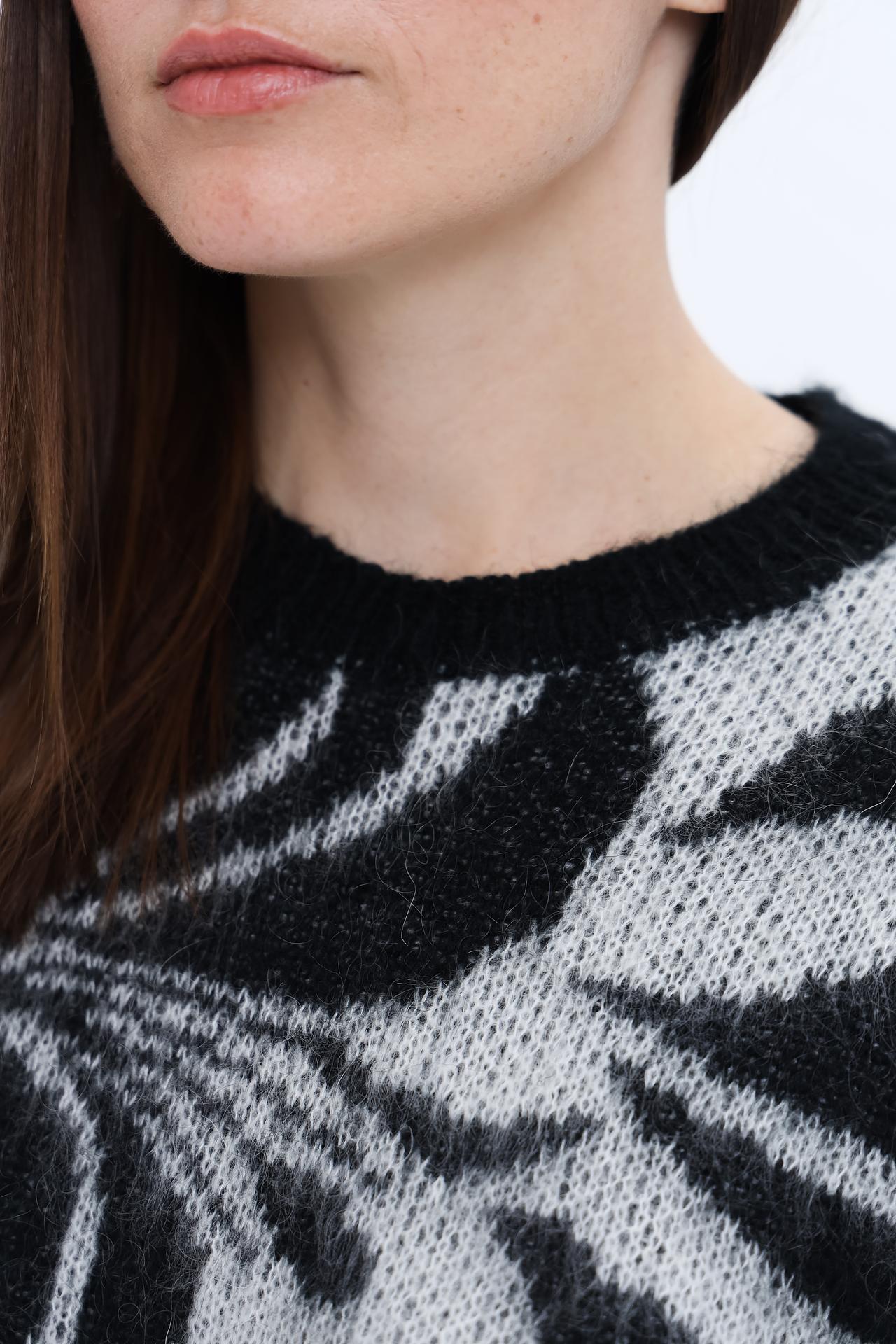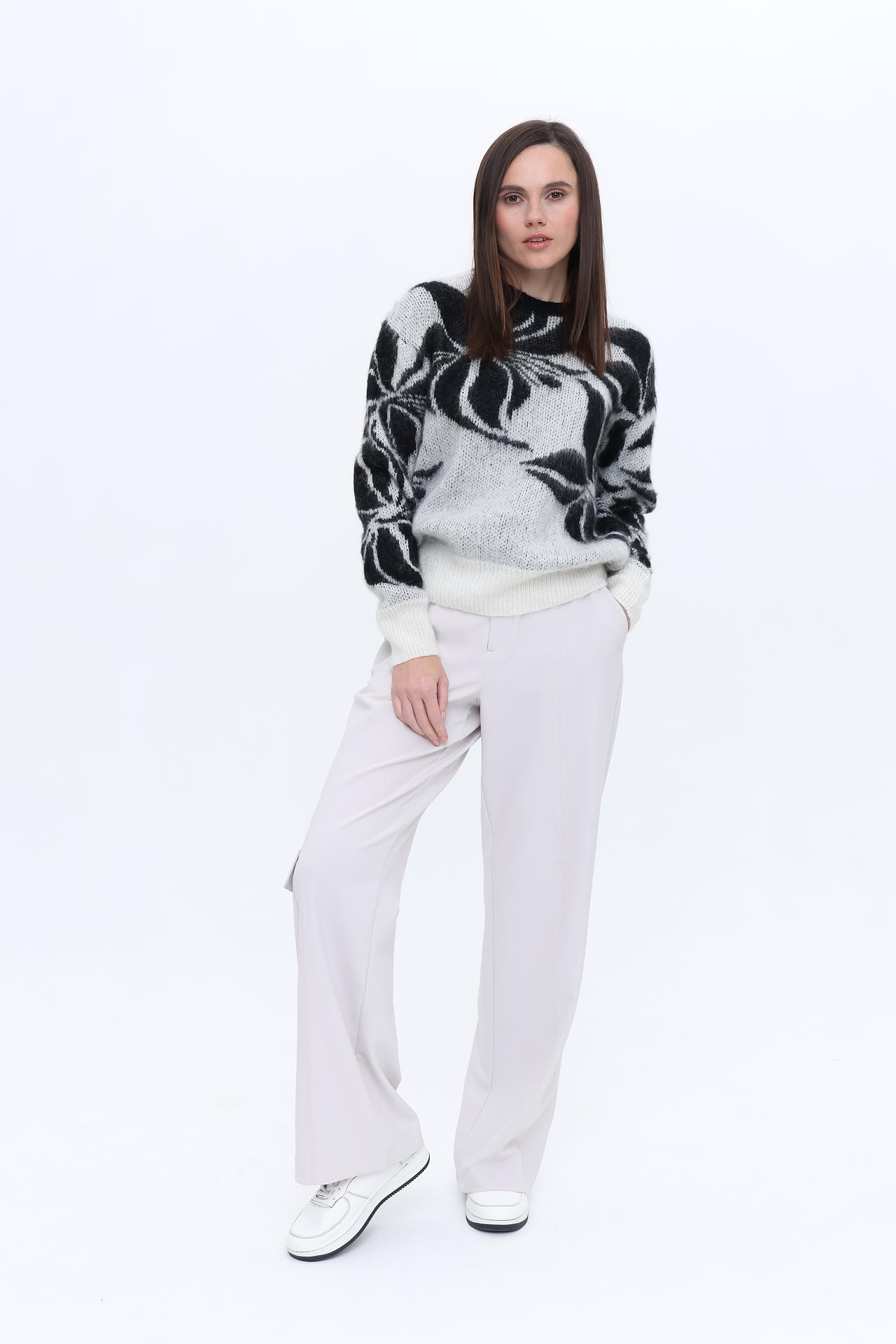 - Дизайн: Стильный черно-белый принт в виде абстрактных цветов, придающий джемперу оригинальности и элегантности.