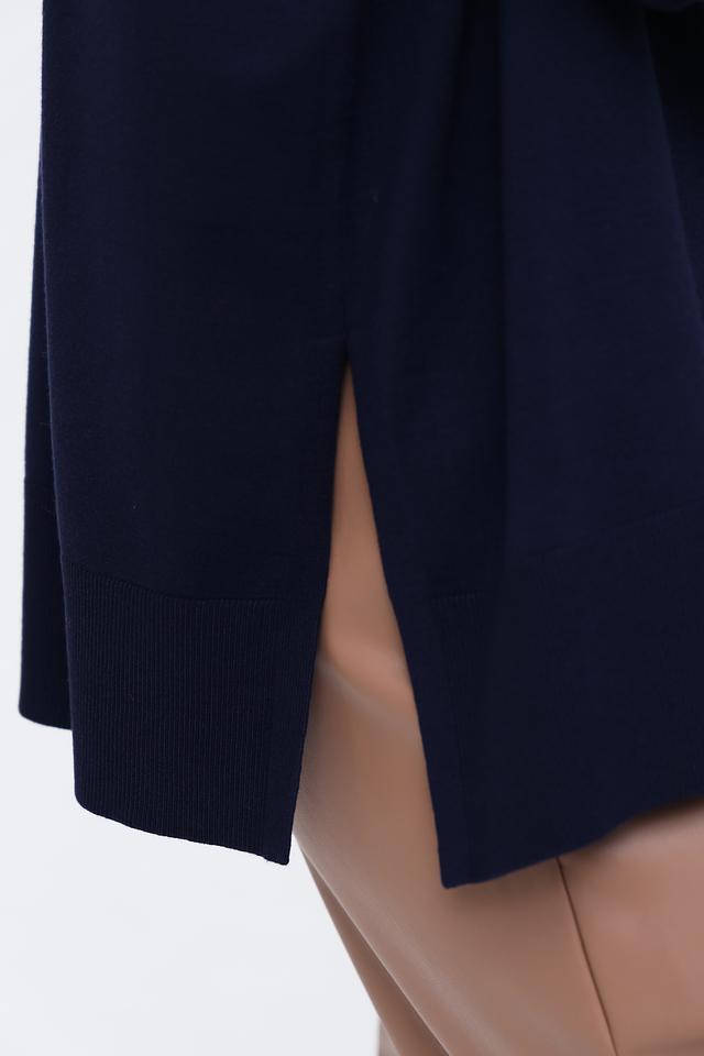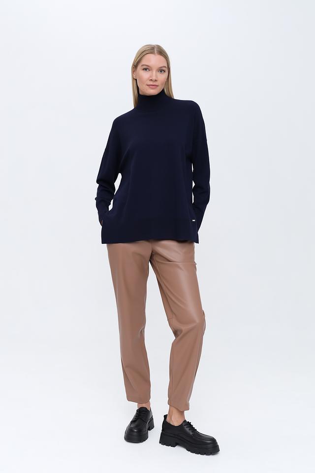 Особенностью модели является вырез на спине, который придает ей оригинальность и женственность. Джемпер имеет свободный крой, не сковывающий движений, и удобный воротник-стойка. Высокое содержание вискозы в составе обеспечивает мягкость и приятные тактильные ощущения.