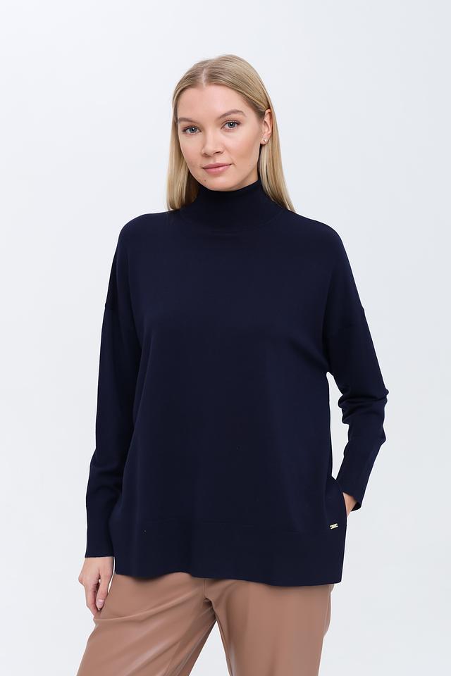 Джемпер Kaos темно-синего цвета с вырезом на спине – стильное и комфортное решение для создания повседневного образа. Модель выполнена из мягкого трикотажа с добавлением вискозы, что обеспечивает приятные ощущения при носке. Состав: вискоза 72%, полиэстер 28%