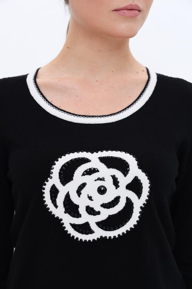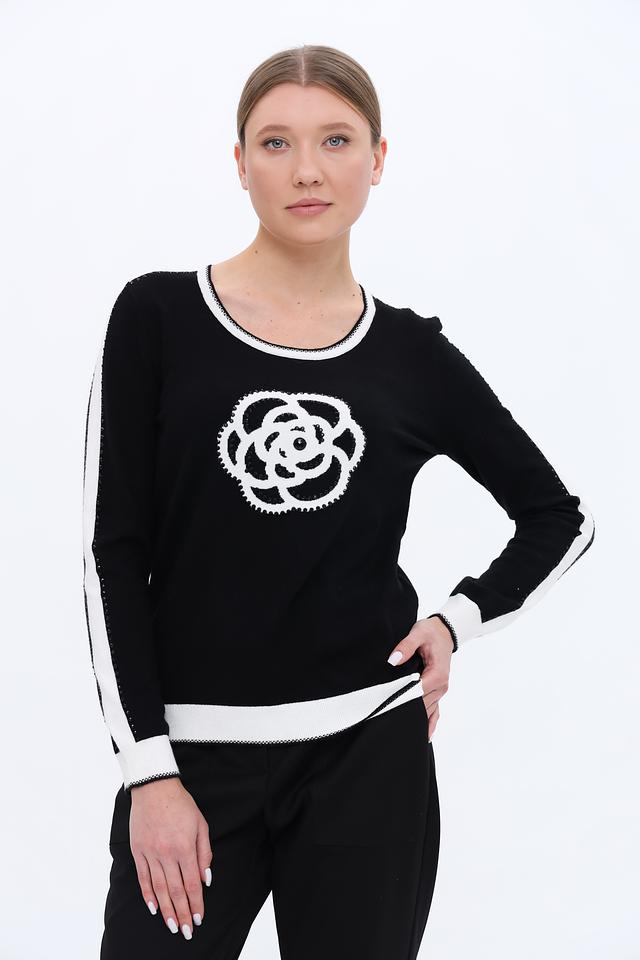 Этот джемпер от Leo & Ugo станет прекрасным дополнением к вашему образу. Он выполнен в классическом чёрном цвете и украшен крупным белым цветком, который придает ему особый шарм.