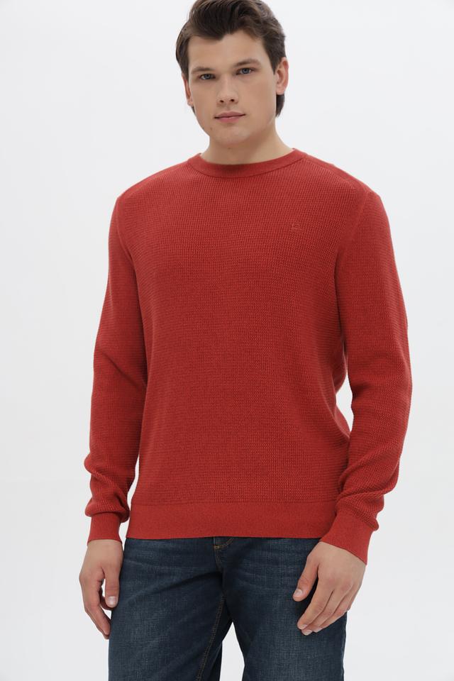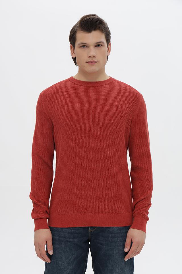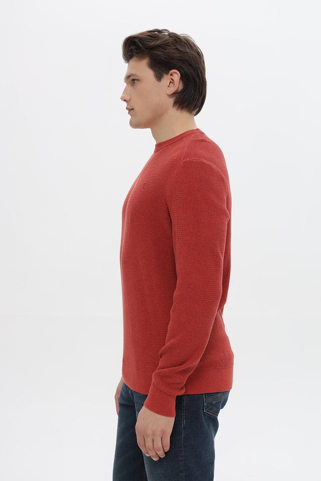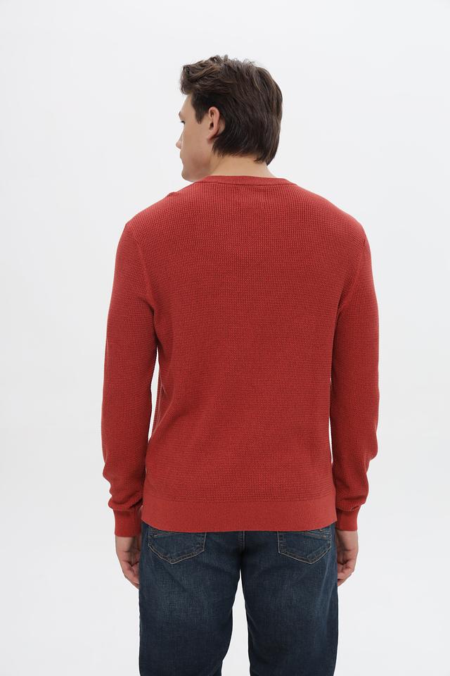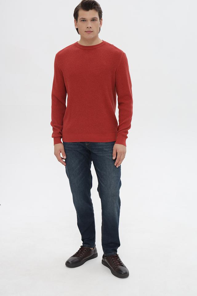 Джемпер имеет терракотовый цвет и фактурную вязку, что придает ему особый шарм и делает его интересным акцентом в вашем образе. Классический круглый вырез горловины и длинные рукава обеспечивают удобную посадку.