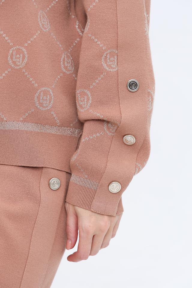 Джемпер имеет приятный бежевый оттенок и украшен узором в клетку, выполненным в светло-серых тонах. Высокий горловина добавляет образу изысканности, а рукава с небольшими декоративными пуговицами придают модели особый шарм.