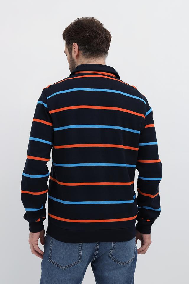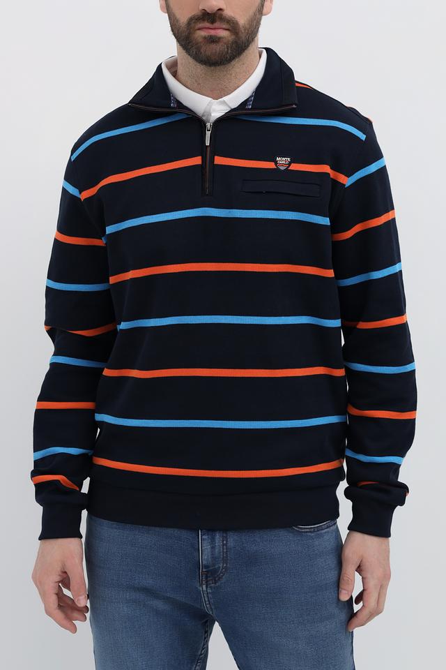Мужской джемпер Monte Carlo синего цвета с яркими оранжевыми и голубыми полосами. Модель с воротником-стойкой и молнией, украшенная логотипом бренда. Изготовлен из мягкого и приятного к телу хлопка с добавлением полиэстера. Состав: хлопок 80%, полиэстер 20%