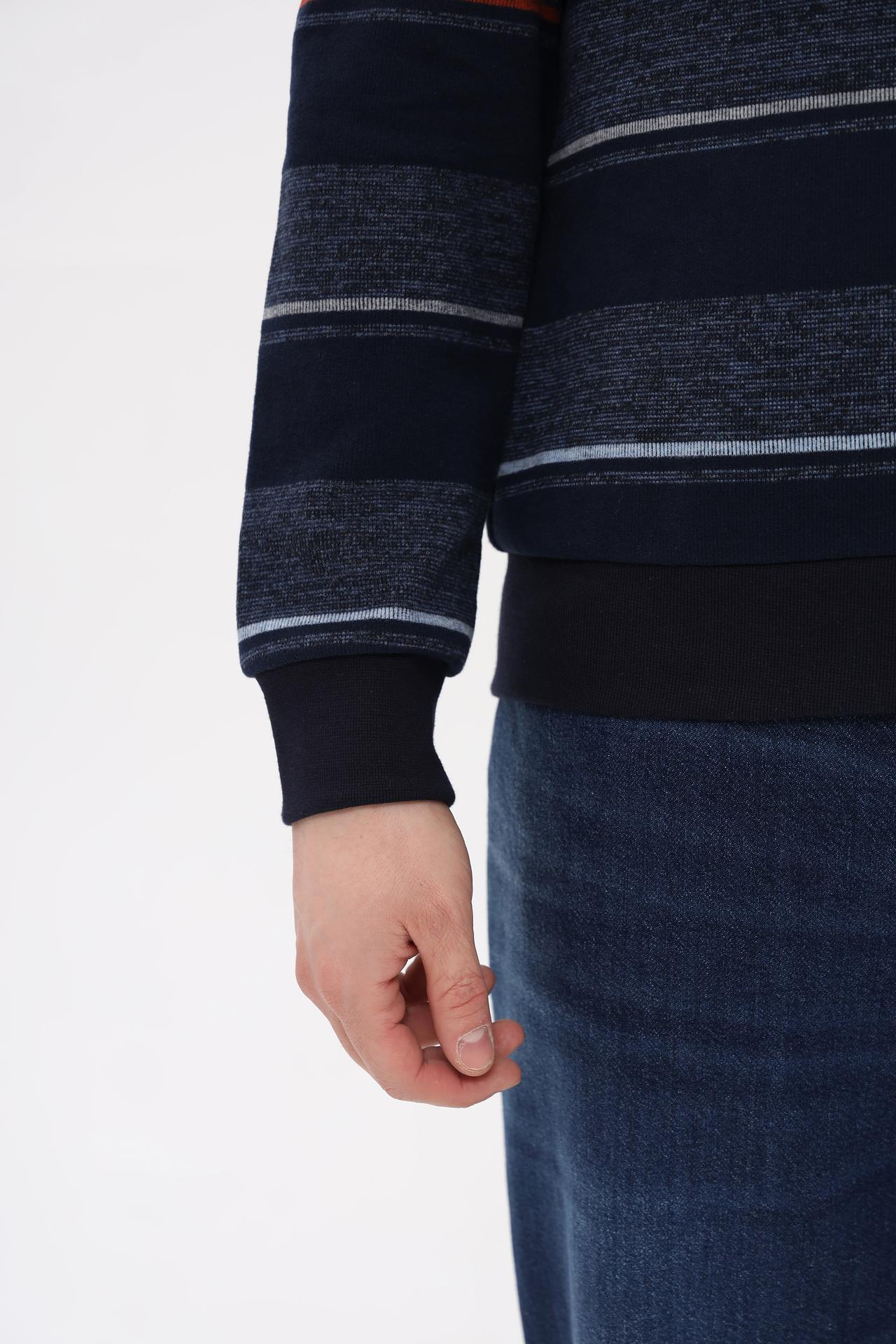 Модель в классическую горизонтальную полоску сочетает оттенки темно-синего, серого и акцентного оранжевого цвета, что придает изделию динамичный и современный вид. Удобная молния до середины груди позволяет регулировать уровень комфорта, а функциональный нагрудный карман добавляет практичности.