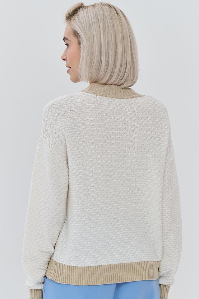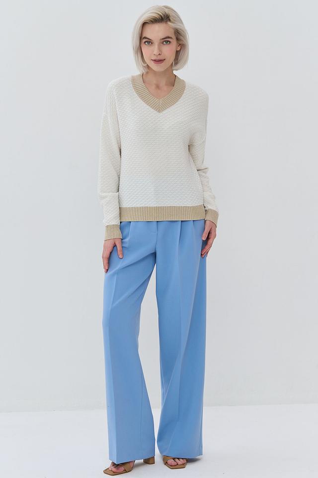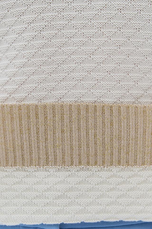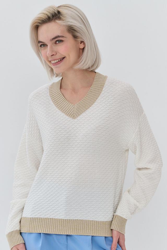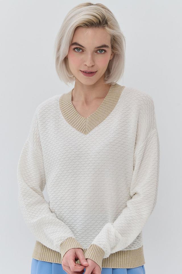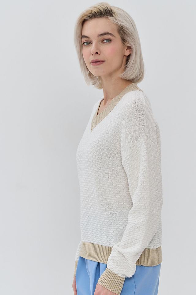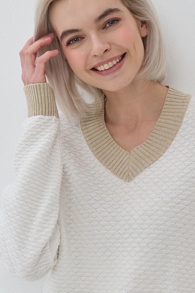 Бежевый джемпер NEWVAY с V-образным вырезом и отделкой в золотистом цвете. Изготовлен из мягкой смеси хлопка и полиэстера, обеспечивающей комфорт и удобство в носке. Состав: хлопок 50%, пан 50%