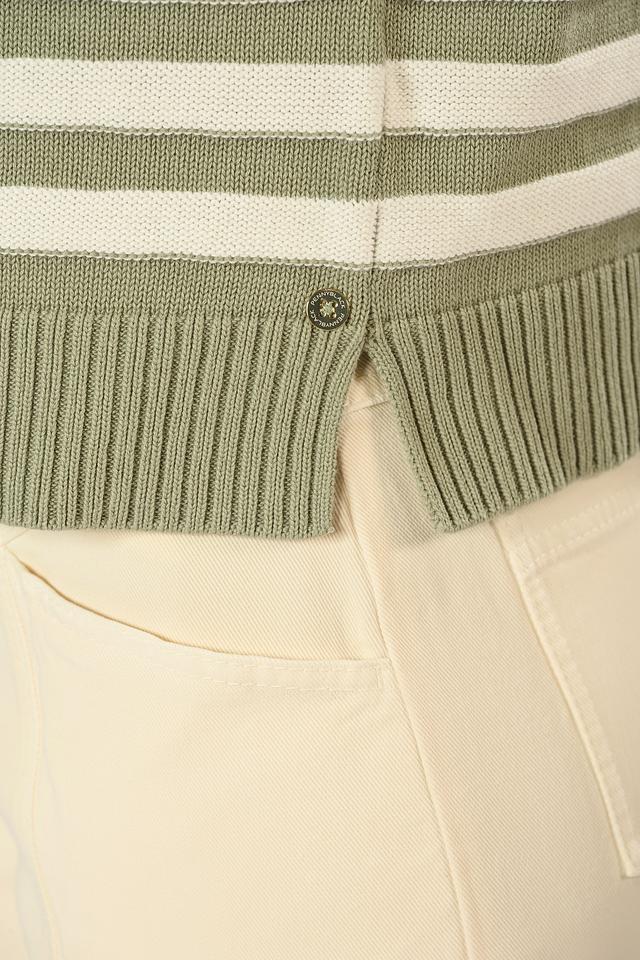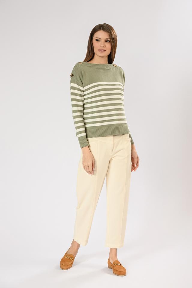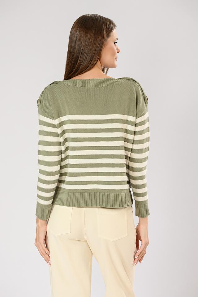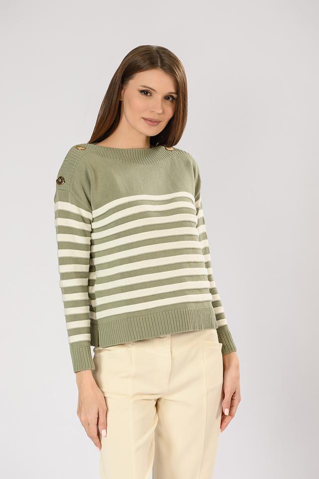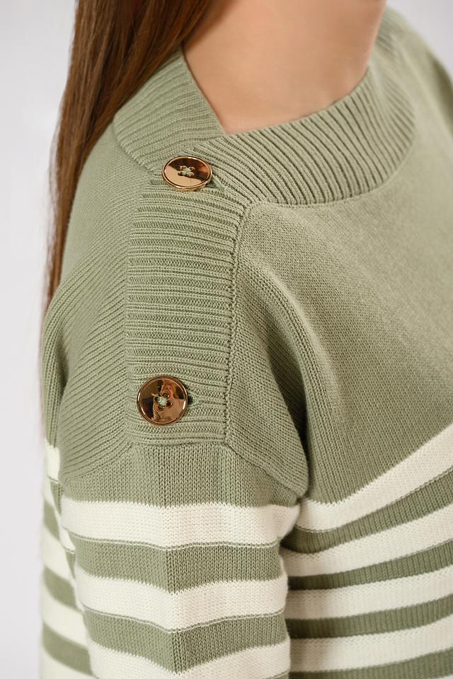 Джемпер имеет классический силуэт и оформлен горизонтальной полоской оливкового и белого цветов. Декоративные пуговицы на плечах добавляют образу изысканности и оригинальности.