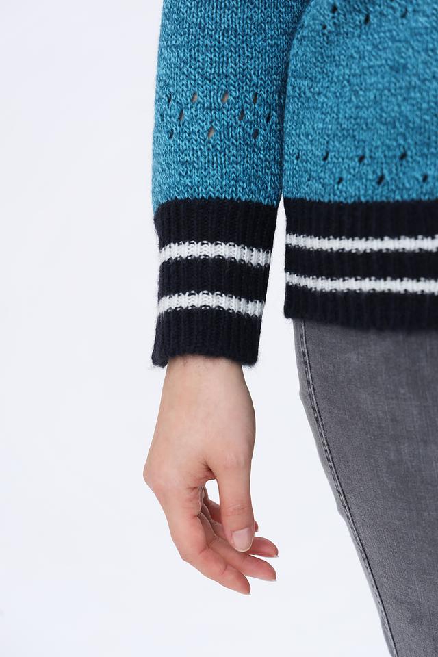 Бирюзовый джемпер Persona N.O.W. с ажурной вязкой и контрастной отделкой. Модель выполнена из мягкого сочетания полиакрила и шерсти, что обеспечивает комфорт и тепло. Стильный и удобный выбор для повседневного гардероба. Состав: полиакрил 70%, шерсть 30%