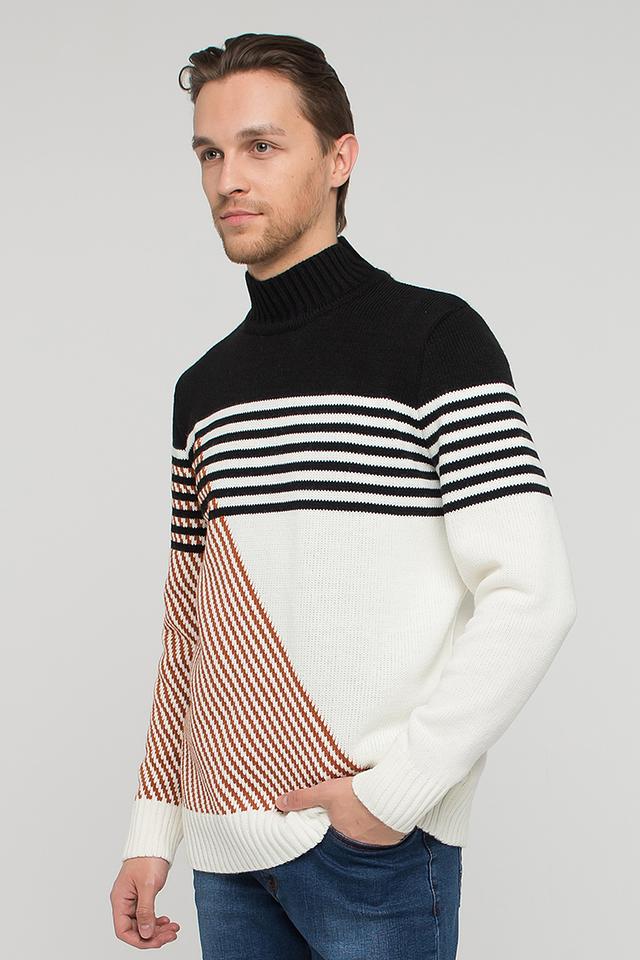 Мужской джемпер BE YOU чёрно-белого цвета с геометричным узором. Изготовлен из сочетания пан и шерсти, что обеспечивает комфорт и тепло. Стильный и универсальный выбор для повседневного гардероба. Состав: пан 70%, шерсть 30%