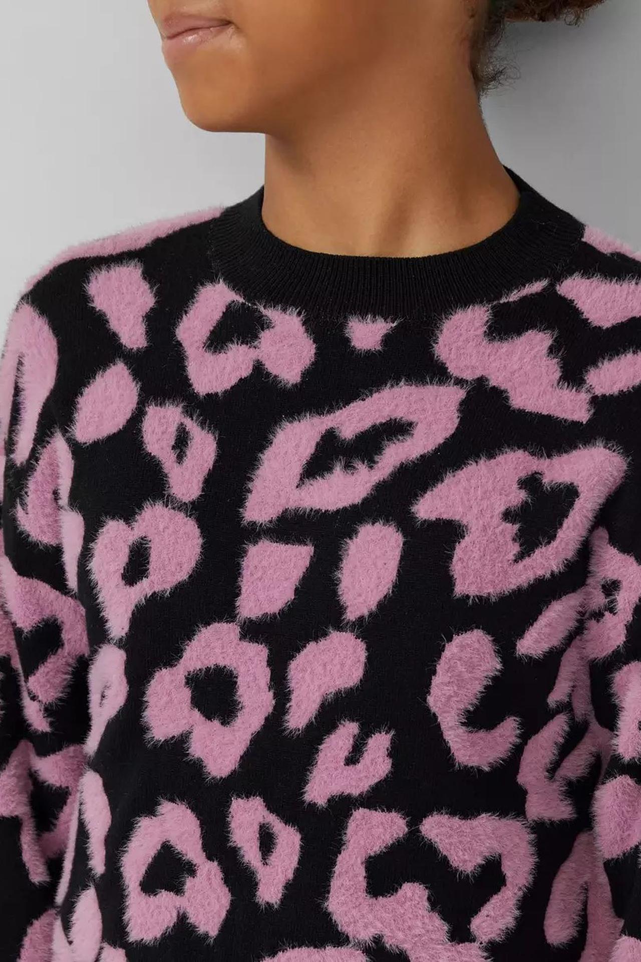 - Дизайн: Актуальный леопардовый принт в черно-розовой гамме придает джемперу модный вид. Классический круглый вырез и длинные рукава делают модель универсальной.